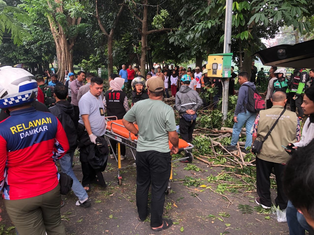 Sebuah dahan pohon angsana tumbang menimpa dua pengendara, mengakibatkan satu korban jiwa dan satu korban luka ringan.