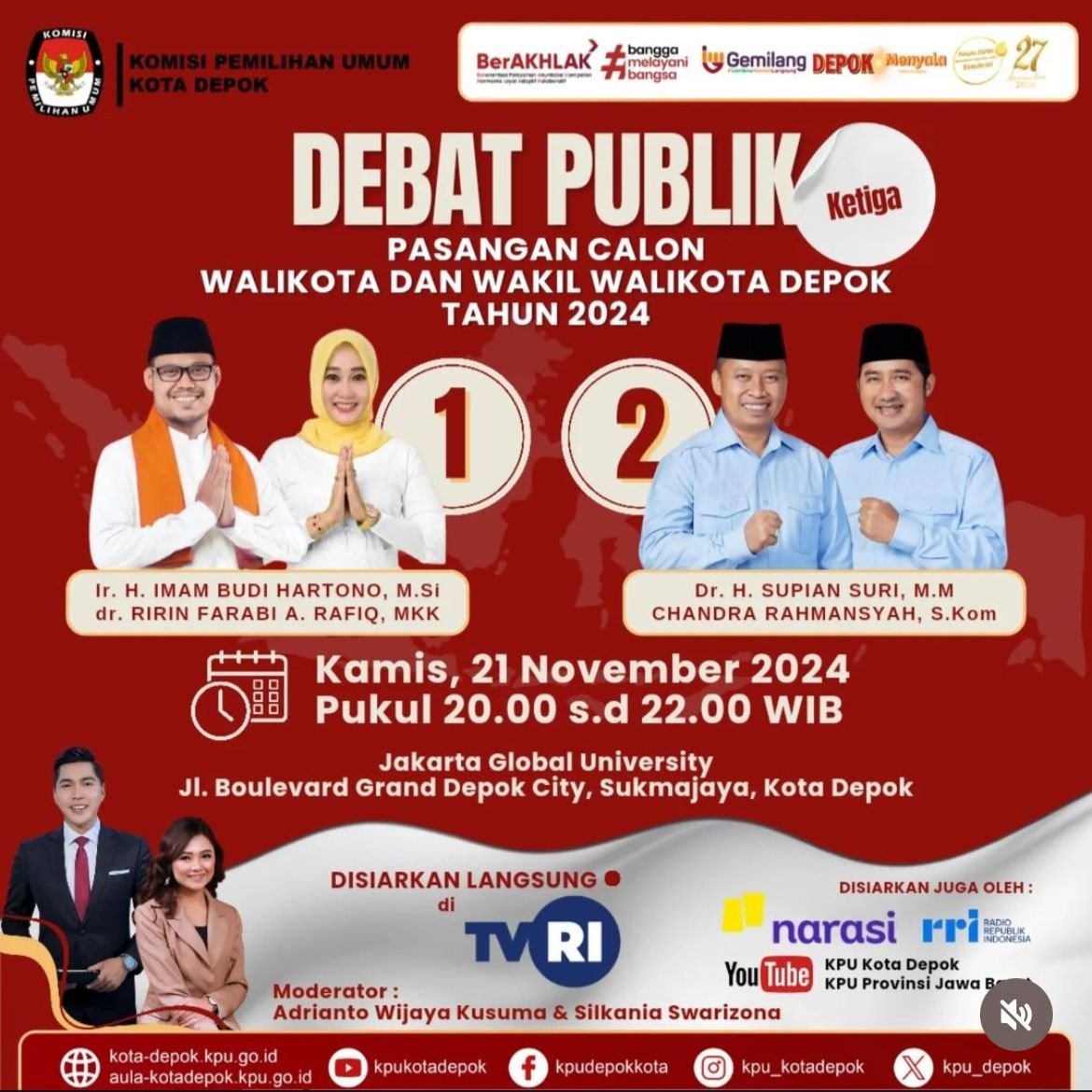 Debat final malam ini menjadi salah satu momen penting dalam rangkaian kampanye menuju Pemilu Wali Kota Depok yang akan digelar pada 27 November 2024.