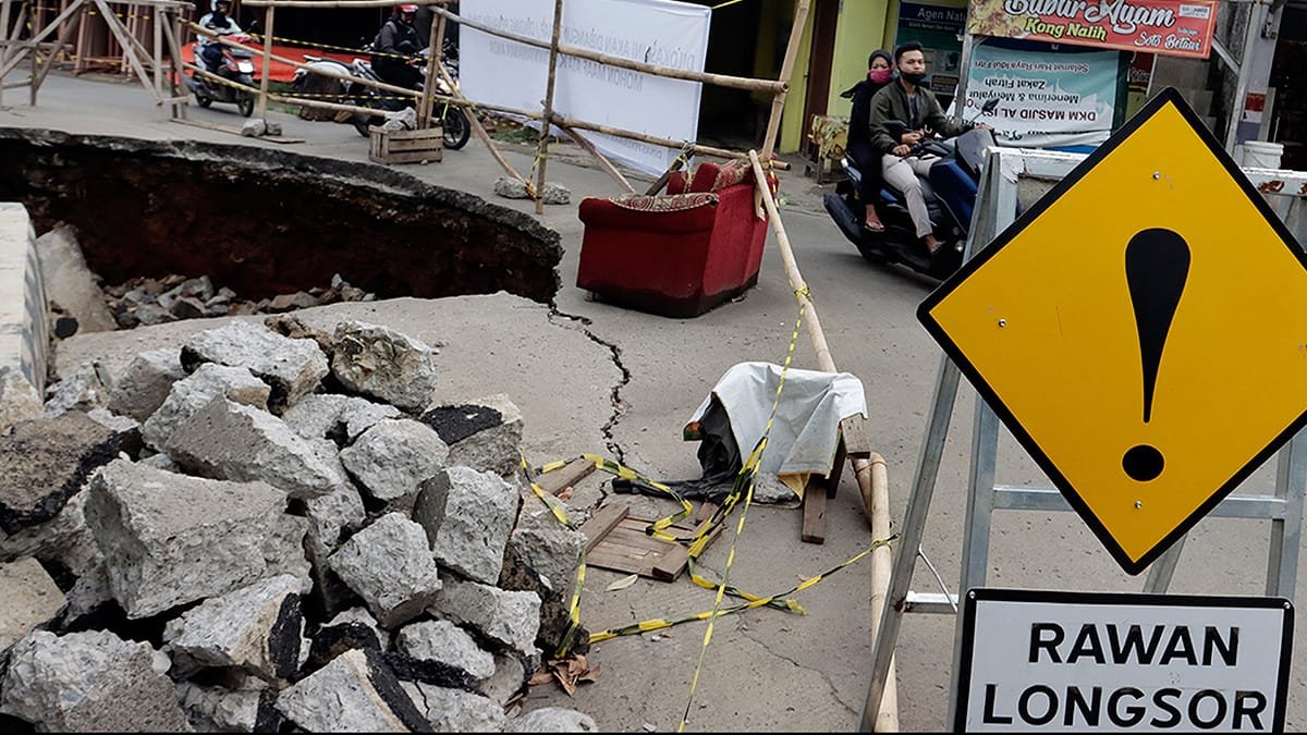 Plang rambu “Rawan Longsor” terpampang di dekat jalan rusak dan amblas di Jalan Wadas, Pancoranmas, Depok, Jawa Barat, Kamis (19/11/2020). Warga sekitar merasa cemas dan berharap jalan ini segera diperbaiki, jangan menunggu proses lelang serta Pilkada Depok 2020 usai. HARNAS.ID | BARRI FATHAILAH