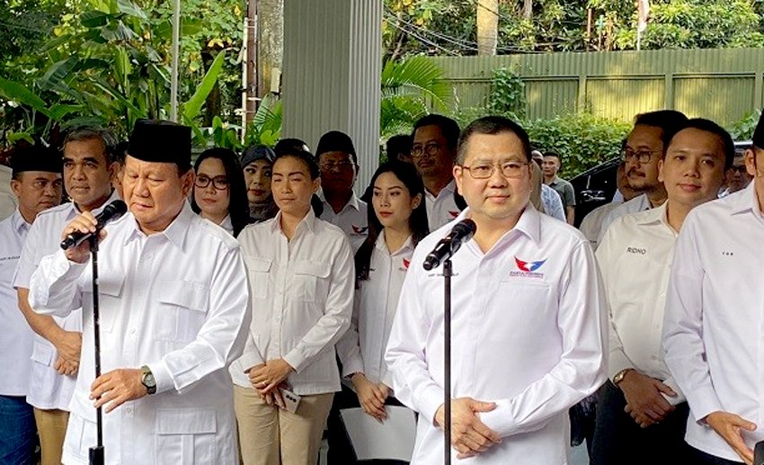 Sebelum memasuki rumah tersebut, HT bersama Prabowo Subianto menyempatkan diri untuk menyapa awak media.