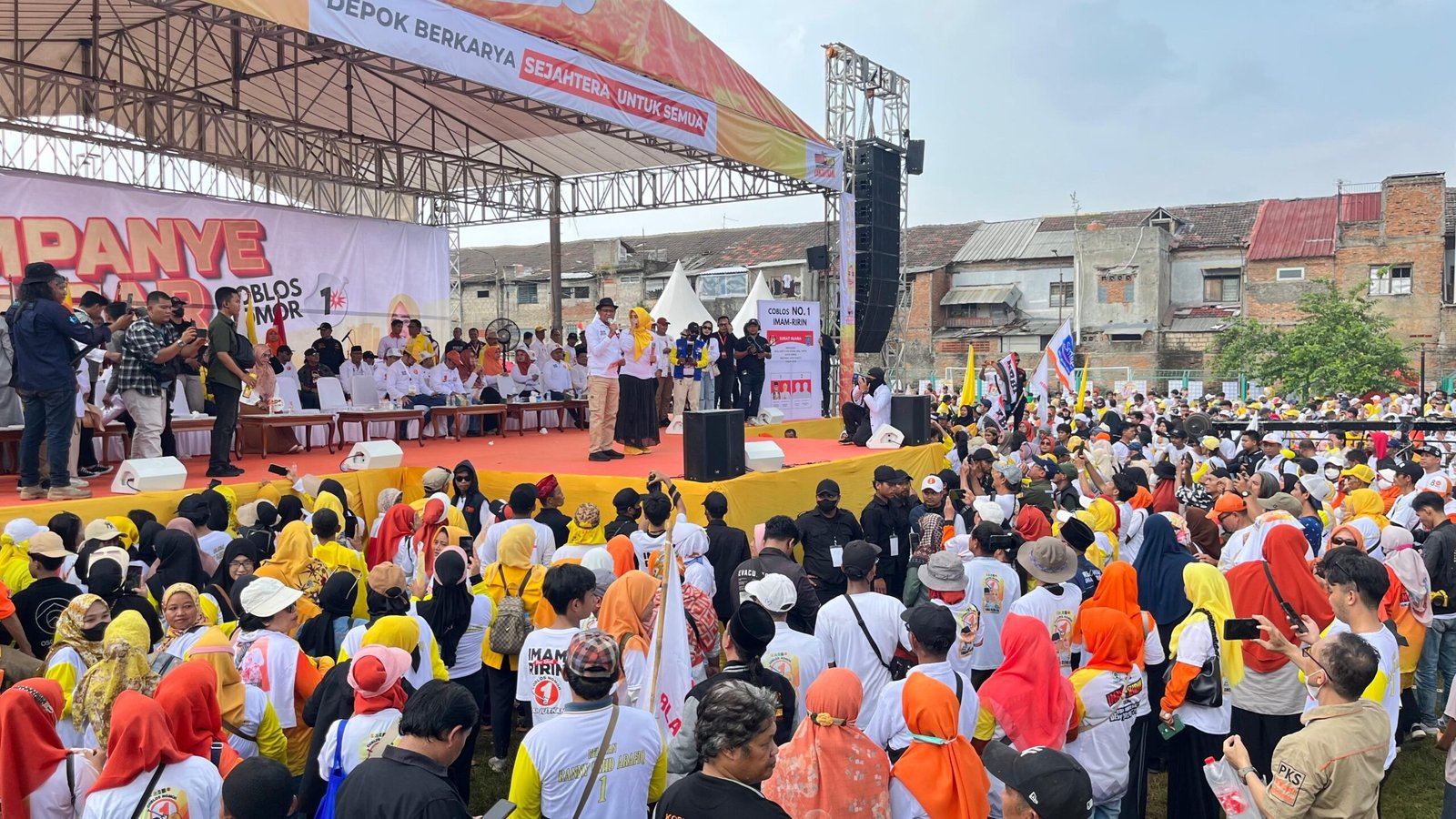 HARNAS.id,Depok-Menjelang hari pemilihan Wali Kota Depok, pasangan nomor utut 1 Imam Budi Hartono-Ririn Farabi A Rafiq menggelar kampanye terbuka di Stadion Mahakam, Sumjaya, Kota Depok, Sabtu (23/11/2024). Dalam kesempatan itu Imam dan pasangannya menyampaikan visi misinya kepada ratusan masyarakat yang hadir dalam acara itu.