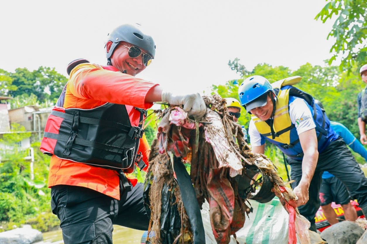 Dalam aksi ini, Jenal Mutaqin bersama unsur lainnya juga menyusuri sungai menggunakan perahu karet dan mengangkut puluhan kilogram sampah.