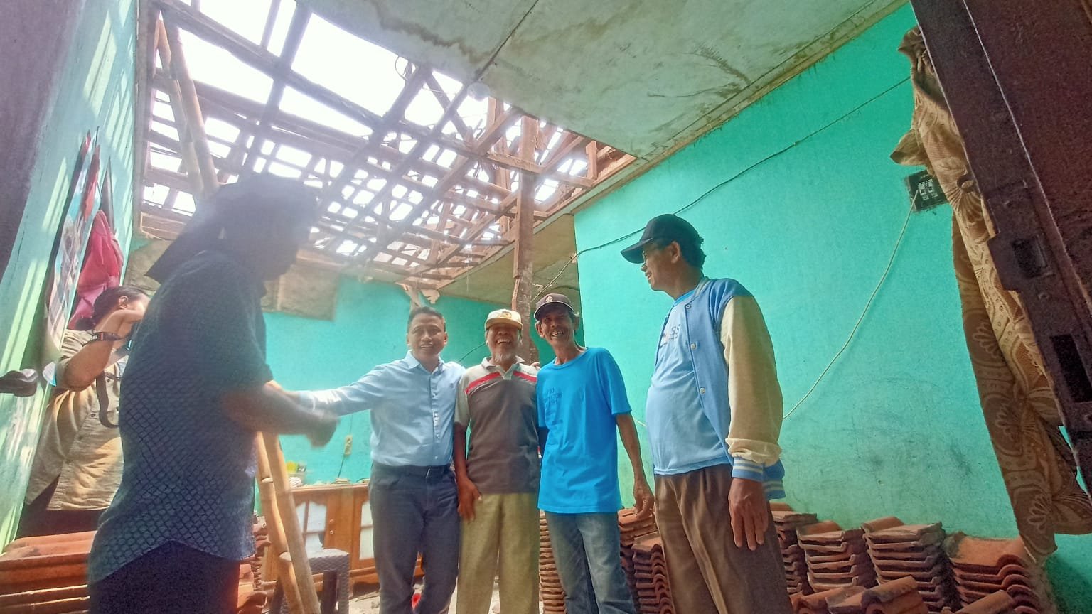 Bersama rombongannya, Supian mengamati bagian rumah yang hancur akibat tergerus air hujan ini.