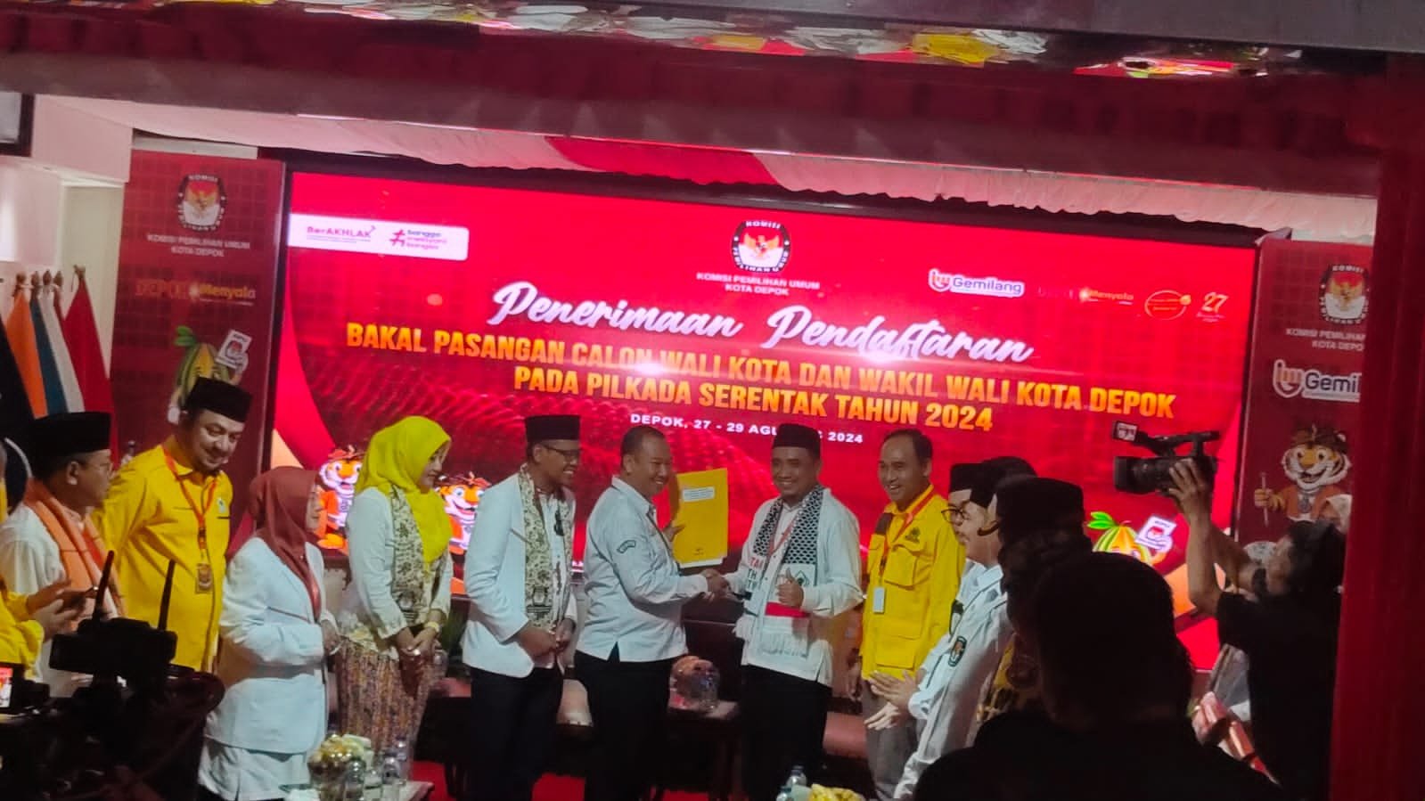 Tampak rombongan pendukung memakai baju putih dan kuning. Diketahui, paslon ini diusung oleh dua partai, yakni PKS dan Golkar. Massa pendukung pun memadati KPU.