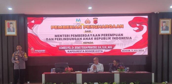 Kota Bogor, Harnas.id – Kementerian Pemberdayaan Perempuan dan Perlindungan Anak (KemenPPPA) RI memberikan penghargaan kepada Kapolresta Bogor Kota, Kombes Pol Bismo Teguh Prakoso, atas perannya dalam penyelenggaraan perlindungan anak yang ada di Kota Bogor melalui program inovatif ” SKCK Goes To School “. Kegiatan ini berlangsung di Aula Mapolresta Bogor Kota pada, Selasa 8 Juli 2024.
