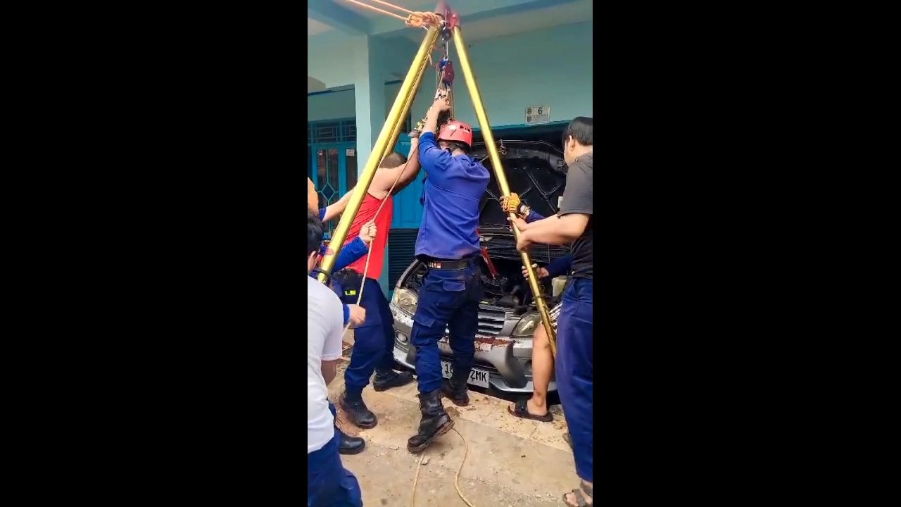 Petugas Dinas Pemadam Kebakaran Kota Depok berupaya mengevakuasi mobil minibus di dalam garasi rumah warga. Dengan menggunakan katrol dan sejumlah peralatn, upaya evakuasi ini berlangung dramatis selama dua jam lebih.