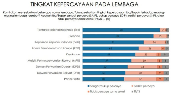 JAKARTA, Harnas.id – Lembaga Survei Indonesia (LSI) merilis hasil survei terbarunya. TNI dan Presiden masih menjadi dua lembaga yang paling dipercaya masyarakat.