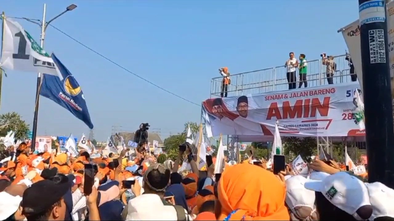 Dari atas panggung, Anies dan Cak Imin melambaikan tangan ke arah masyarakat yang berada di jalan.