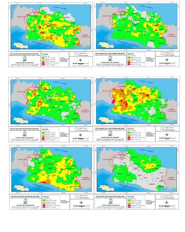 Berdasarkan prakiraan perkembangan dinamika atmosfer pada skala global, regional dan lokal, serta model cuaca deterministik dan probabilistik, diprakirakan hujan dengan intensitas ringan hingga sedang masih berpotensi terjadi di sebagian wilayah Jawa Barat, potensi hujan sedang hingga lebat/sangat lebat disertai kilat/petir dan angin kencang yang dapat terjadi pada skala lokal dan durasi singkat terdapat di sebagian wilayah Kota Bogor pada tanggal 2 – 3 dan 5 – 7 Desember 2024 dan untuk sebagian wilayah Kabupaten Bogor pada tanggal 2 – 8 Desember 2024.