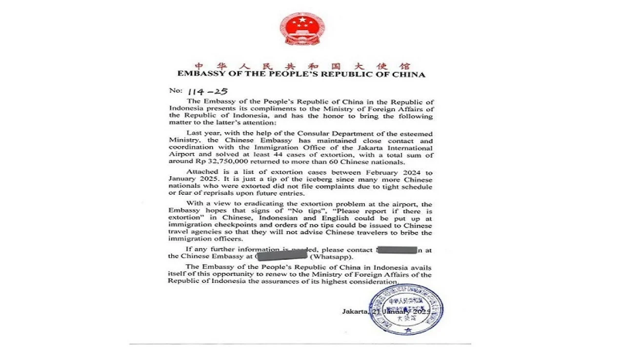 Dalam suratnya, Kedubes China menyebutkan bahwa mereka telah berkoordinasi dengan Kantor Imigrasi Bandara Internasional Jakarta untuk menangani kasus pemerasan tersebut.
