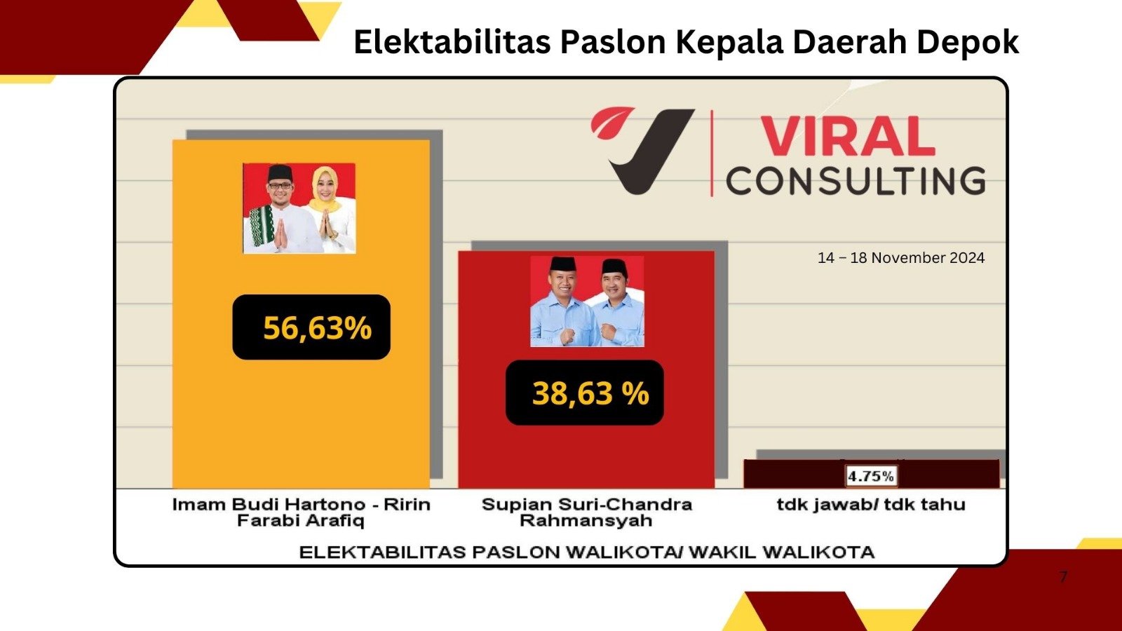 Peneliti Viral Consulting, Yusuf Donner mengungkap, survei publik dalam kurun 14-18 November 2024 dengan sampel 800 responden dari seluruh kecamatan di Kota Depok, dengan Metode Multistage Proportional Random Sampling atas jumlah DPT Pilkada Depok berusia 17 tahun keatas/ sudah menikah, dengan margin of error 3,46 % dengan tingkat kepercayaan 95 % dan quality control sebesar 20 % terhadap sampel yang ada.