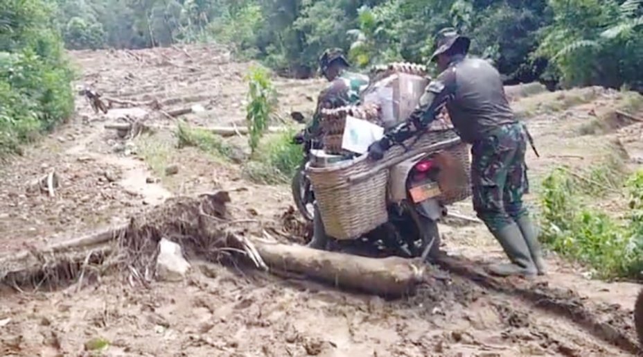 Prajurit TNI AD di lapangan tidak hanya membantu evakuasi warga, tetapi juga mendistribusikan bantuan ke pos-pos pengungsian yang sulit dijangkau. Mereka harus menempuh medan berlumpur, bahkan mendorong sepeda motor untuk membawa bantuan logistik ke titik-titik yang terputus aksesnya.