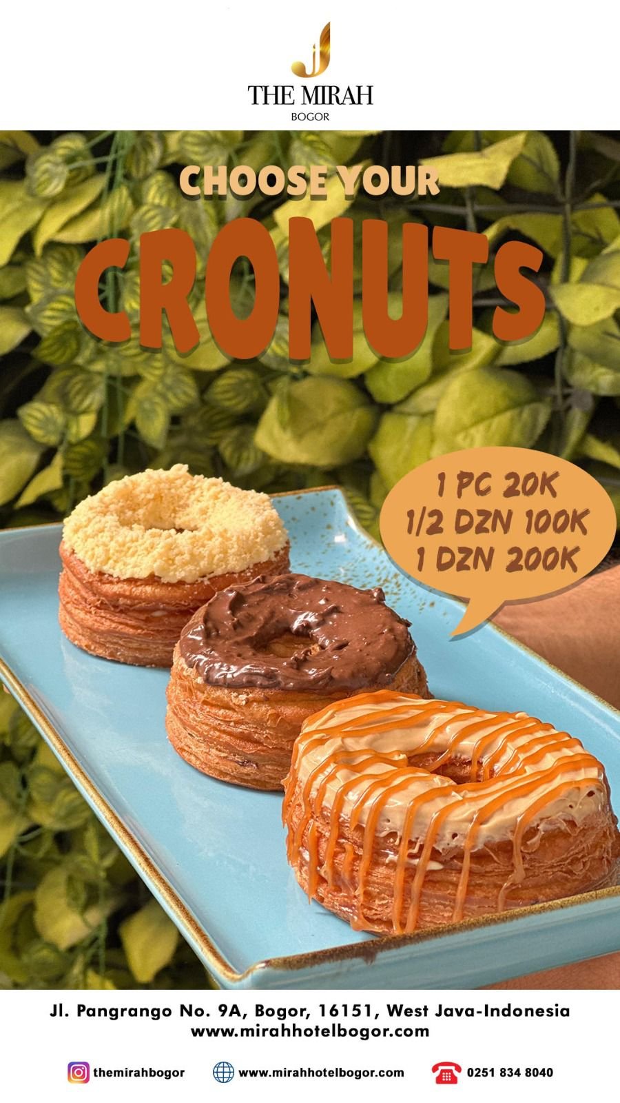Fannia, Sales & Marketing Manager The Mirah Hotel, menjelaskan bahwa Cronuts dapat dinikmati di Coffee Lounge, Piccolo Coffee, yang berlokasi di The Mirah Hotel. Tamu dapat memilih untuk menikmati Cronuts di tempat atau membawanya pulang (take away).