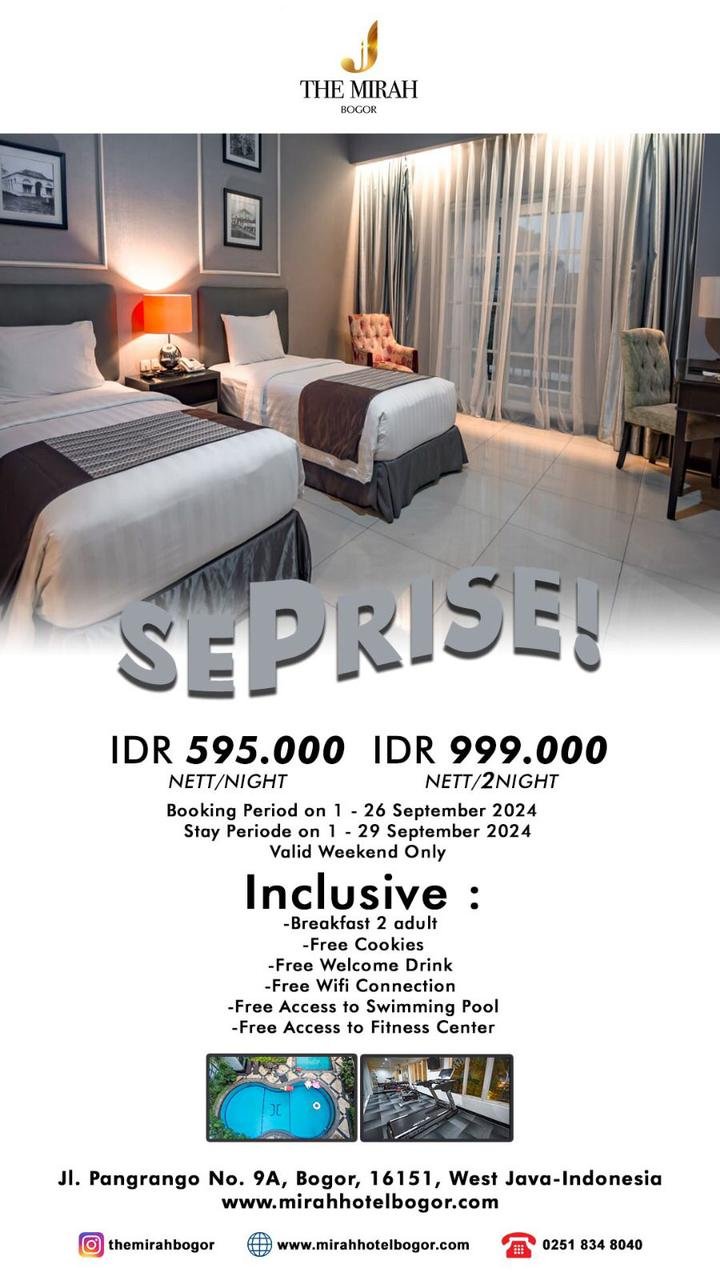 “Selain itu, The Mirah Hotel juga menawarkan ‘Surprise Promo’ untuk kamar yang berlaku hingga akhir September 2024. Dengan harga spesial Rp 595.000 nett per kamar per malam, tamu dapat menikmati berbagai fasilitas lengkap, termasuk sarapan untuk dua orang, satu Cookies Mirah, serta akses ke kolam renang dan gym,” ungkap Fannia pada Selasa (10/9).