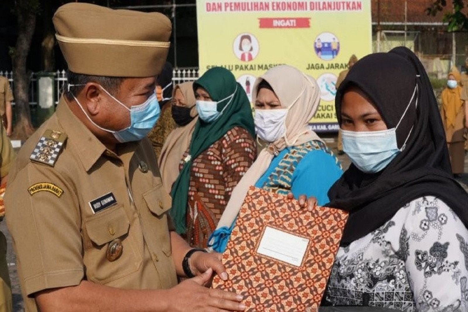 Bupati Garut Rudy Gunawan memberikan penghargaan kepada warga yang sudah lulus dari Program Keluarga Harapan (PKH) di lapangan Sekretariat Kabupaten Garut, Jawa Barat, Senin (9/11/2020) | ANTARA