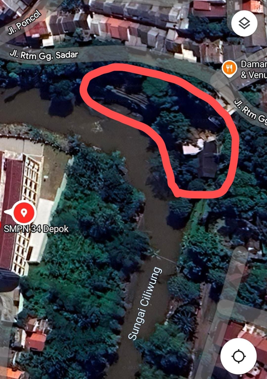 Harnas.id,DEPOK-Terungkap adanya pelanggaran serius terhadap tata ruang dan konservasi lingkungan di kawasan Sungai Ciliwung. Bangunan fisik seluas 1.717 meter persegi ditemukan berdiri di atas badan air Sungai Ciliwung, tepatnya di Jalan Sadar Kelapa Dua, RT 08/RW 10, Kelurahan Tugu, Kecamatan Cimanggis, Kota Depok, pada titik koordinat 6°21’41″S 106°50’23″E.
