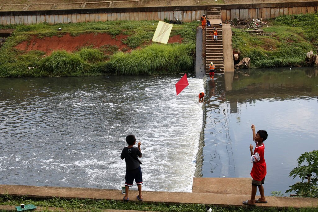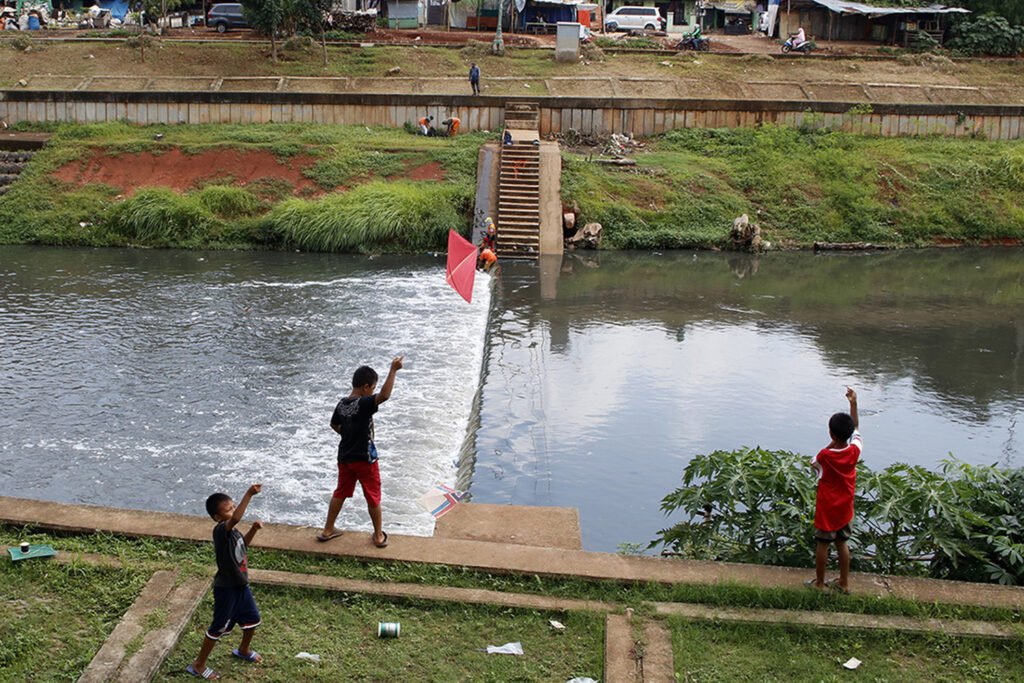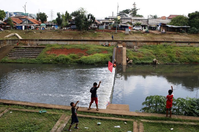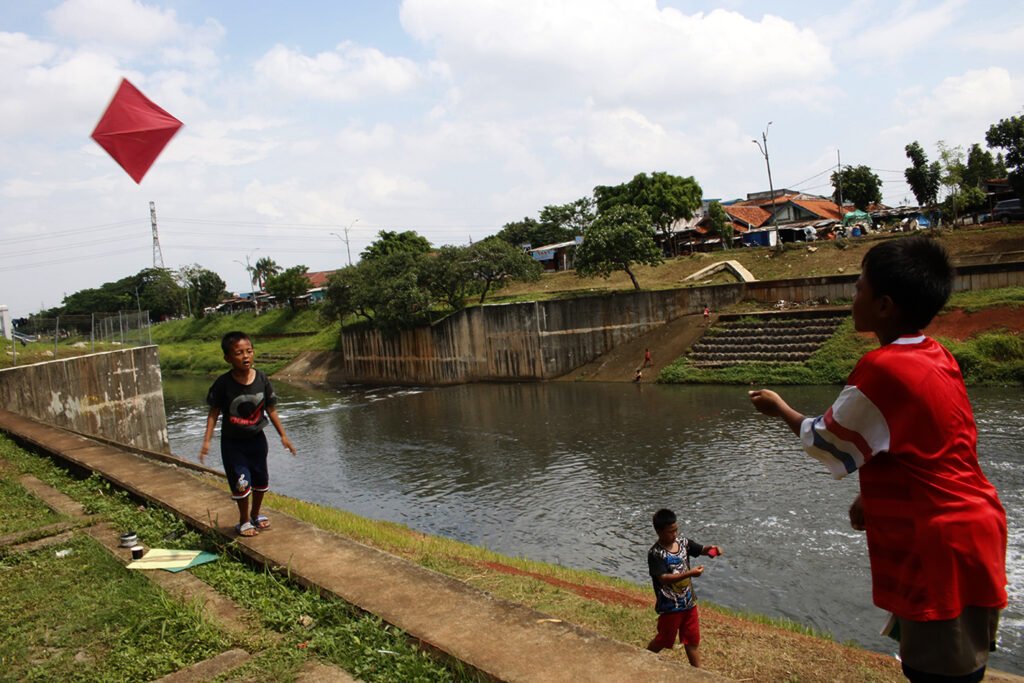 Anak-anak bermain layangan di area Banjir Kanal Timur (BKT), Kelurahan Cipinang Besar Selatan, Jakarta Timur, Kamis (3/12/2020). Minimnya lahan bermain di Ibu Kota, membuat anak-anak terpaksa bermain di kawasan sekitar yang berpotensi membahayakan keselamatan mereka. HARNAS.ID | BARRI FATHAILAH
