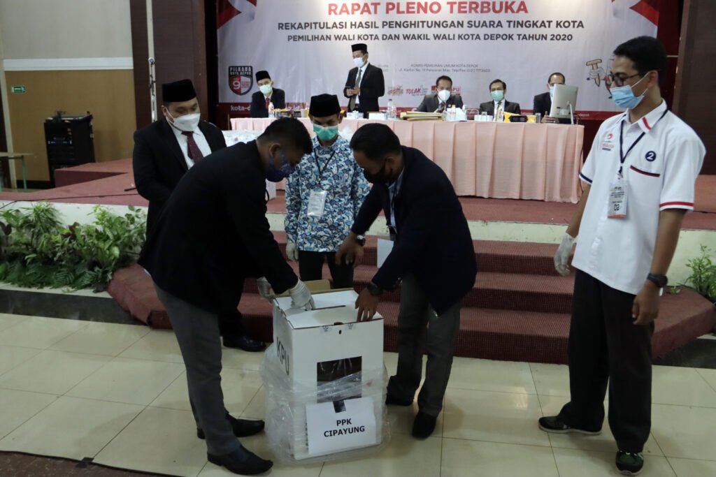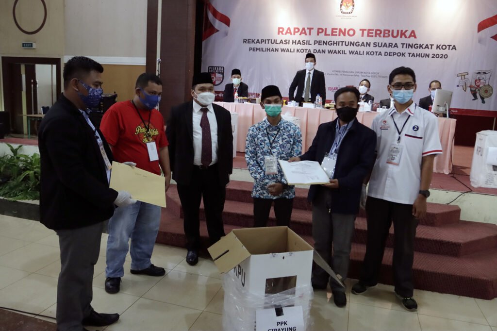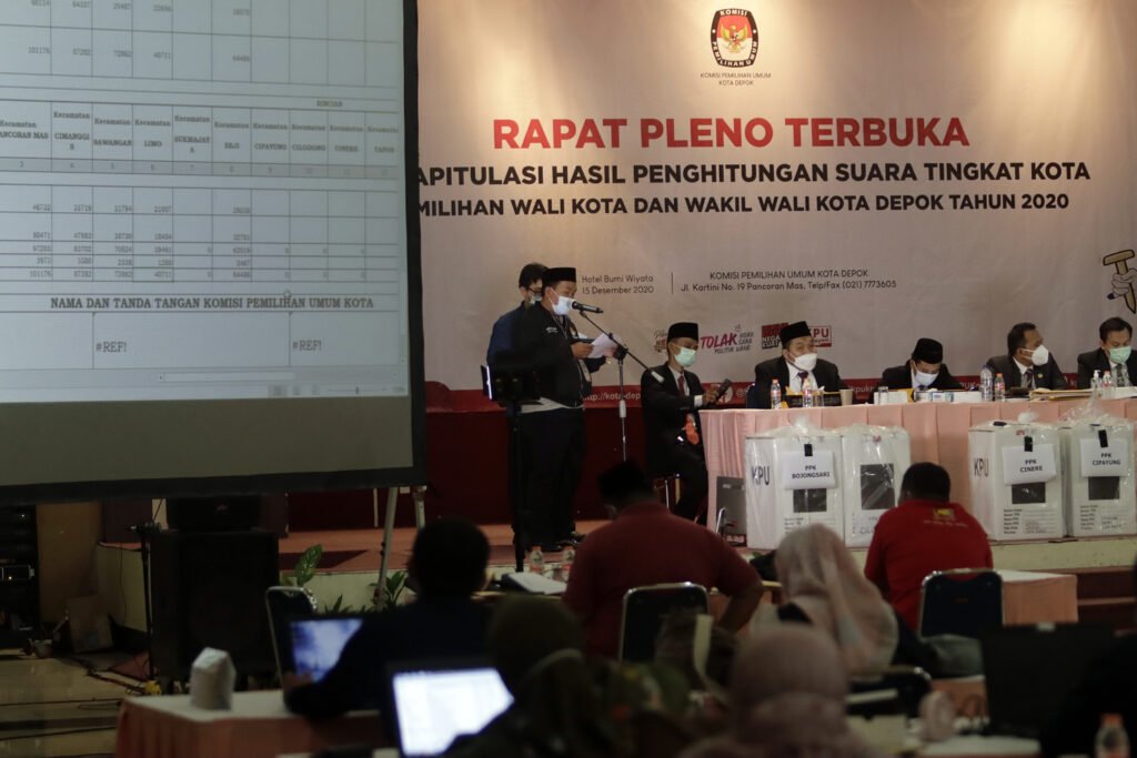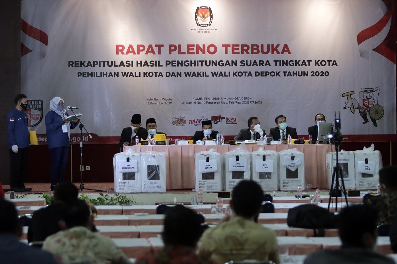 Komisioner KPU Kota Depok menyimak paparan hasil suara petugas panitia pemilihan kecamatan (PPK) saat memimpin Rapat Pleno Terbuka Rekapitulasi Hasil Penghitungan Suara Tingkat Kota pada Pemilihan Wali Kota dan Wakil Wali Kota Depok 2O20 di Hotel Bumi Wiyata, Depok, Selasa (15/12/2020). KPU Kota Depok resmi menetapkan pasangan nomor urut 2 pada Pilkada Depok, Mohammad Idris-Imam Budi Hartono sebagai pemimpin terpilih Kota Depok periode 2021-2026, dengan raihan suara 55,55 persen dari pasangan Pradi Supriatna-Afifah Alia yakni 44,45 persen. HARNAS.ID | BARRI FATHAILAHSaksi dari pasangan calon melihat layar hasil suara Rapat Pleno Terbuka Rekapitulasi Hasil Penghitungan Suara Tingkat Kota pada Pemilihan Wali Kota dan Wakil Wali Kota Depok 2O20 di Hotel Bumi Wiyata, Depok, Selasa (15/12/2020). KPU Kota Depok resmi menetapkan pasangan nomor urut 2 pada Pilkada Depok, Mohammad Idris-Imam Budi Hartono sebagai pemimpin terpilih Kota Depok periode 2021-2026, dengan raihan suara 55,55 persen dari pasangan Pradi Supriatna-Afifah Alia yakni 44,45 persen. HARNAS.ID | BARRI FATHAILAHSaksi dari pasangan calon melihat layar hasil suara Rapat Pleno Terbuka Rekapitulasi Hasil Penghitungan Suara Tingkat Kota pada Pemilihan Wali Kota dan Wakil Wali Kota Depok 2O20 di Hotel Bumi Wiyata, Depok, Selasa (15/12/2020). KPU Kota Depok resmi menetapkan pasangan nomor urut 2 pada Pilkada Depok, Mohammad Idris-Imam Budi Hartono sebagai pemimpin terpilih Kota Depok periode 2021-2026, dengan raihan suara 55,55 persen dari pasangan Pradi Supriatna-Afifah Alia yakni 44,45 persen. HARNAS.ID | BARRI FATHAILAHSaksi dari pasangan calon melihat layar hasil suara Rapat Pleno Terbuka Rekapitulasi Hasil Penghitungan Suara Tingkat Kota pada Pemilihan Wali Kota dan Wakil Wali Kota Depok 2O20 di Hotel Bumi Wiyata, Depok, Selasa (15/12/2020). KPU Kota Depok resmi menetapkan pasangan nomor urut 2 pada Pilkada Depok, Mohammad Idris-Imam Budi Hartono sebagai pemimpin terpilih Kota Depok periode 2021-2026, dengan raihan suara 55,55 persen dari pasangan Pradi Supriatna-Afifah Alia yakni 44,45 persen. HARNAS.ID | BARRI FATHAILAHPetugas PPK membuka kotak suara saat Rapat Pleno Terbuka Rekapitulasi Hasil Penghitungan Suara Tingkat Kota pada Pemilihan Wali Kota dan Wakil Wali Kota Depok 2O20 di Hotel Bumi Wiyata, Depok, Selasa (15/12/2020). KPU Kota Depok resmi menetapkan pasangan nomor urut 2 pada Pilkada Depok, Mohammad Idris-Imam Budi Hartono sebagai pemimpin terpilih Kota Depok periode 2021-2026, dengan raihan suara 55,55 persen dari pasangan Pradi Supriatna-Afifah Alia yakni 44,45 persen. HARNAS.ID | BARRI FATHAILAHPetugas PPK membuka kotak suara saat Rapat Pleno Terbuka Rekapitulasi Hasil Penghitungan Suara Tingkat Kota pada Pemilihan Wali Kota dan Wakil Wali Kota Depok 2O20 di Hotel Bumi Wiyata, Depok, Selasa (15/12/2020). KPU Kota Depok resmi menetapkan pasangan nomor urut 2 pada Pilkada Depok, Mohammad Idris-Imam Budi Hartono sebagai pemimpin terpilih Kota Depok periode 2021-2026, dengan raihan suara 55,55 persen dari pasangan Pradi Supriatna-Afifah Alia yakni 44,45 persen. HARNAS.ID | BARRI FATHAILAHPetugas PPK menunjukkan surat suara saat Rapat Pleno Terbuka Rekapitulasi Hasil Penghitungan Suara Tingkat Kota Pemilihan Walikota dan Wakil Walikota Depok tahun 2O20 di Hotel Bumi Wiyata, Depok, Selasa (15/12/2020). KPU Kota Depok resmi menetapkan pasangan nomor urut 2 pada Pilkada Depok, Mohammad Idris-Imam Budi Hartono sebagai pemimpin terpilih Kota Depok periode 2021-2026, dengan raihan suara 55,55 persen dari pasangan Pradi Supriatna-Afifah Alia yakni 44,45 persen. HARNAS.ID | BARRI FATHAILAHPetugas PPK menunjukkan surat suara saat Rapat Pleno Terbuka Rekapitulasi Hasil Penghitungan Suara Tingkat Kota Pemilihan Walikota dan Wakil Walikota Depok tahun 2O20 di Hotel Bumi Wiyata, Depok, Selasa (15/12/2020). KPU Kota Depok resmi menetapkan pasangan nomor urut 2 pada Pilkada Depok, Mohammad Idris-Imam Budi Hartono sebagai pemimpin terpilih Kota Depok periode 2021-2026, dengan raihan suara 55,55 persen dari pasangan Pradi Supriatna-Afifah Alia yakni 44,45 persen. HARNAS.ID | BARRI FATHAILAHPetugas PPK menyerahkan hasil suara kepada Komisioner KPU Kota Depok saat Rapat Pleno Terbuka Rekapitulasi Hasil Penghitungan Suara Tingkat Kota Pemilihan Walikota dan Wakil Walikota Depok tahun 2O20 di Hotel Bumi Wiyata, Depok, Selasa (15/12/2020). KPU Kota Depok resmi menetapkan pasangan nomor urut 2 pada Pilkada Depok, Mohammad Idris-Imam Budi Hartono sebagai pemimpin terpilih Kota Depok periode 2021-2026, dengan raihan suara 55,55 persen dari pasangan Pradi Supriatna-Afifah Alia yakni 44,45 persen. HARNAS.ID | BARRI FATHAILAH