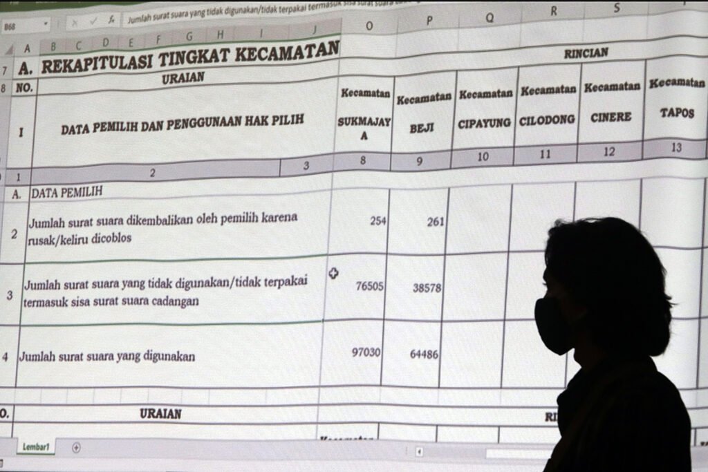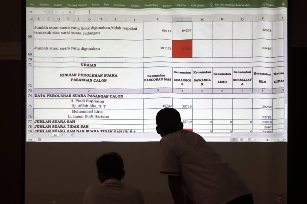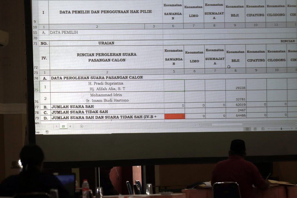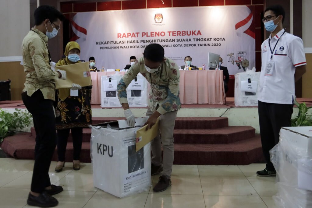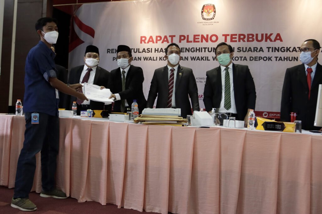 Komisioner KPU Kota Depok menyimak paparan hasil suara petugas panitia pemilihan kecamatan (PPK) saat memimpin Rapat Pleno Terbuka Rekapitulasi Hasil Penghitungan Suara Tingkat Kota pada Pemilihan Wali Kota dan Wakil Wali Kota Depok 2O20 di Hotel Bumi Wiyata, Depok, Selasa (15/12/2020). KPU Kota Depok resmi menetapkan pasangan nomor urut 2 pada Pilkada Depok, Mohammad Idris-Imam Budi Hartono sebagai pemimpin terpilih Kota Depok periode 2021-2026, dengan raihan suara 55,55 persen dari pasangan Pradi Supriatna-Afifah Alia yakni 44,45 persen. HARNAS.ID | BARRI FATHAILAHSaksi dari pasangan calon melihat layar hasil suara Rapat Pleno Terbuka Rekapitulasi Hasil Penghitungan Suara Tingkat Kota pada Pemilihan Wali Kota dan Wakil Wali Kota Depok 2O20 di Hotel Bumi Wiyata, Depok, Selasa (15/12/2020). KPU Kota Depok resmi menetapkan pasangan nomor urut 2 pada Pilkada Depok, Mohammad Idris-Imam Budi Hartono sebagai pemimpin terpilih Kota Depok periode 2021-2026, dengan raihan suara 55,55 persen dari pasangan Pradi Supriatna-Afifah Alia yakni 44,45 persen. HARNAS.ID | BARRI FATHAILAHSaksi dari pasangan calon melihat layar hasil suara Rapat Pleno Terbuka Rekapitulasi Hasil Penghitungan Suara Tingkat Kota pada Pemilihan Wali Kota dan Wakil Wali Kota Depok 2O20 di Hotel Bumi Wiyata, Depok, Selasa (15/12/2020). KPU Kota Depok resmi menetapkan pasangan nomor urut 2 pada Pilkada Depok, Mohammad Idris-Imam Budi Hartono sebagai pemimpin terpilih Kota Depok periode 2021-2026, dengan raihan suara 55,55 persen dari pasangan Pradi Supriatna-Afifah Alia yakni 44,45 persen. HARNAS.ID | BARRI FATHAILAHSaksi dari pasangan calon melihat layar hasil suara Rapat Pleno Terbuka Rekapitulasi Hasil Penghitungan Suara Tingkat Kota pada Pemilihan Wali Kota dan Wakil Wali Kota Depok 2O20 di Hotel Bumi Wiyata, Depok, Selasa (15/12/2020). KPU Kota Depok resmi menetapkan pasangan nomor urut 2 pada Pilkada Depok, Mohammad Idris-Imam Budi Hartono sebagai pemimpin terpilih Kota Depok periode 2021-2026, dengan raihan suara 55,55 persen dari pasangan Pradi Supriatna-Afifah Alia yakni 44,45 persen. HARNAS.ID | BARRI FATHAILAHPetugas PPK membuka kotak suara saat Rapat Pleno Terbuka Rekapitulasi Hasil Penghitungan Suara Tingkat Kota pada Pemilihan Wali Kota dan Wakil Wali Kota Depok 2O20 di Hotel Bumi Wiyata, Depok, Selasa (15/12/2020). KPU Kota Depok resmi menetapkan pasangan nomor urut 2 pada Pilkada Depok, Mohammad Idris-Imam Budi Hartono sebagai pemimpin terpilih Kota Depok periode 2021-2026, dengan raihan suara 55,55 persen dari pasangan Pradi Supriatna-Afifah Alia yakni 44,45 persen. HARNAS.ID | BARRI FATHAILAHPetugas PPK membuka kotak suara saat Rapat Pleno Terbuka Rekapitulasi Hasil Penghitungan Suara Tingkat Kota pada Pemilihan Wali Kota dan Wakil Wali Kota Depok 2O20 di Hotel Bumi Wiyata, Depok, Selasa (15/12/2020). KPU Kota Depok resmi menetapkan pasangan nomor urut 2 pada Pilkada Depok, Mohammad Idris-Imam Budi Hartono sebagai pemimpin terpilih Kota Depok periode 2021-2026, dengan raihan suara 55,55 persen dari pasangan Pradi Supriatna-Afifah Alia yakni 44,45 persen. HARNAS.ID | BARRI FATHAILAHPetugas PPK menunjukkan surat suara saat Rapat Pleno Terbuka Rekapitulasi Hasil Penghitungan Suara Tingkat Kota Pemilihan Walikota dan Wakil Walikota Depok tahun 2O20 di Hotel Bumi Wiyata, Depok, Selasa (15/12/2020). KPU Kota Depok resmi menetapkan pasangan nomor urut 2 pada Pilkada Depok, Mohammad Idris-Imam Budi Hartono sebagai pemimpin terpilih Kota Depok periode 2021-2026, dengan raihan suara 55,55 persen dari pasangan Pradi Supriatna-Afifah Alia yakni 44,45 persen. HARNAS.ID | BARRI FATHAILAHPetugas PPK menunjukkan surat suara saat Rapat Pleno Terbuka Rekapitulasi Hasil Penghitungan Suara Tingkat Kota Pemilihan Walikota dan Wakil Walikota Depok tahun 2O20 di Hotel Bumi Wiyata, Depok, Selasa (15/12/2020). KPU Kota Depok resmi menetapkan pasangan nomor urut 2 pada Pilkada Depok, Mohammad Idris-Imam Budi Hartono sebagai pemimpin terpilih Kota Depok periode 2021-2026, dengan raihan suara 55,55 persen dari pasangan Pradi Supriatna-Afifah Alia yakni 44,45 persen. HARNAS.ID | BARRI FATHAILAHPetugas PPK menyerahkan hasil suara kepada Komisioner KPU Kota Depok saat Rapat Pleno Terbuka Rekapitulasi Hasil Penghitungan Suara Tingkat Kota Pemilihan Walikota dan Wakil Walikota Depok tahun 2O20 di Hotel Bumi Wiyata, Depok, Selasa (15/12/2020). KPU Kota Depok resmi menetapkan pasangan nomor urut 2 pada Pilkada Depok, Mohammad Idris-Imam Budi Hartono sebagai pemimpin terpilih Kota Depok periode 2021-2026, dengan raihan suara 55,55 persen dari pasangan Pradi Supriatna-Afifah Alia yakni 44,45 persen. HARNAS.ID | BARRI FATHAILAH