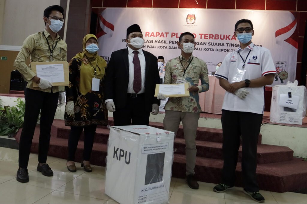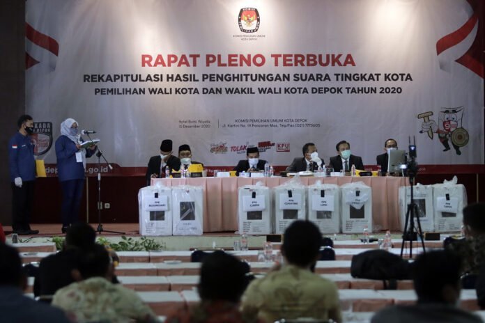 Sejumlah Komisioner KPU Kota Depok menyimak paparan hasil suara petugas panitia pemilihan kecamatan (PPK) saat memimpin Rapat Pleno Terbuka Rekapitulasi Hasil Penghitungan Suara Tingkat Kota pada Pemilihan Wali Kota dan Wakil Wali Kota Depok 2O20 di Hotel Bumi Wiyata, Depok, Selasa (15/12/2020). KPU Kota Depok resmi menetapkan pasangan nomor urut 2 pada Pilkada Depok, Mohammad Idris-Imam Budi Hartono sebagai pemimpin terpilih Kota Depok periode 2021-2026, dengan raihan suara 55,55 persen dari pasangan Pradi Supriatna-Afifah Alia yakni 44,45 persen. HARNAS.ID | BARRI FATHAILAH