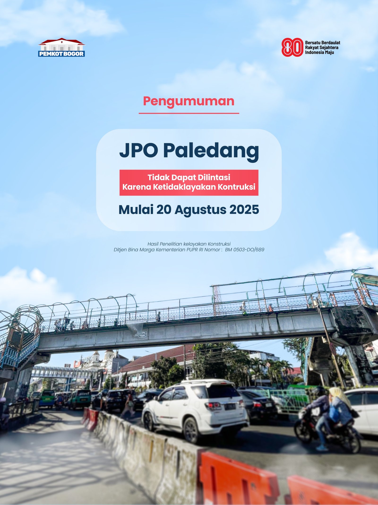 “Kami memahami JPO Paledang cukup vital bagi aktivitas masyarakat, namun hasil penelitian resmi menyatakan kondisinya sudah sangat berbahaya. Untuk itu, Pemkot Bogor bersama pihak terkait akan segera melaksanakan pembongkaran. ujar Dedie Rachim, Selasa (19/8/2025).