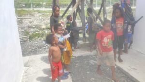 Anak-anak Sinak bermain di dekat tandon air Gudang Logistik BNPB di Sinak, Papua.