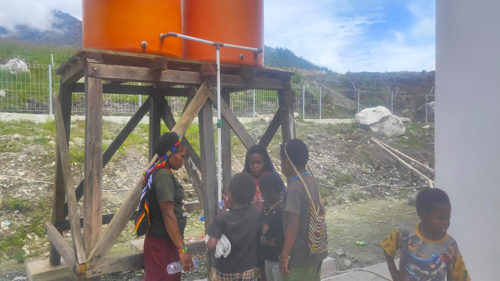 Anak-anak Sinak bermain di dekat tandon air Gudang Logistik BNPB di Sinak, Papua.