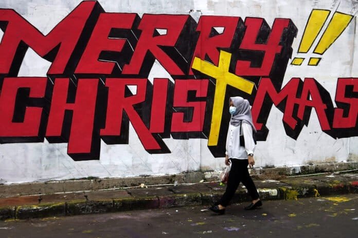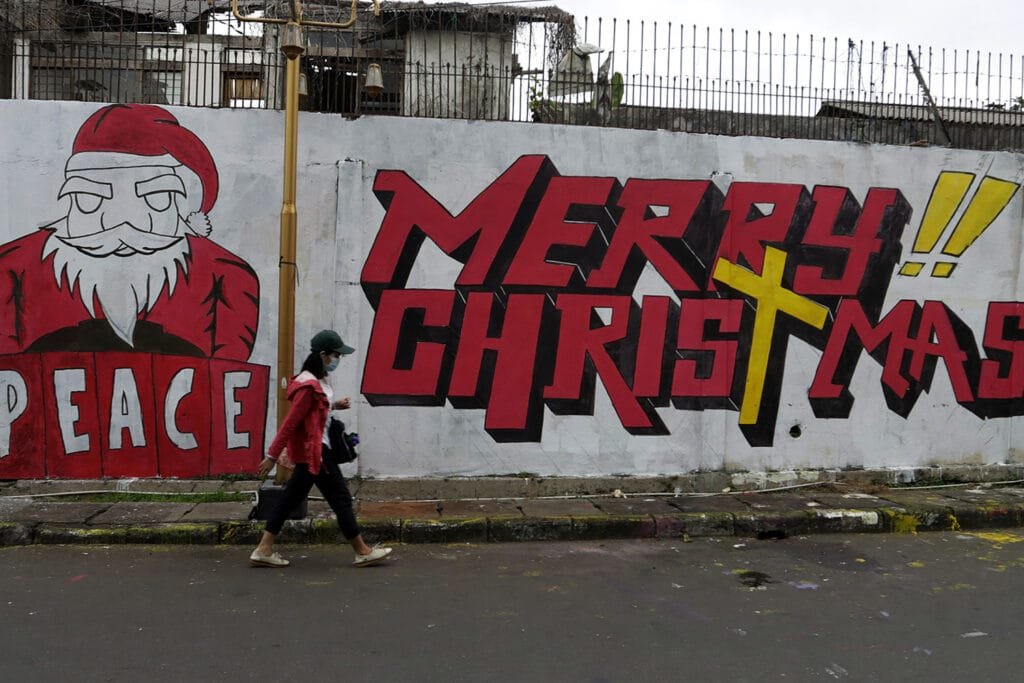 Warga melintas di depan mural bertemakan Natal, dengan latar tulisan “Merry Christmas” di Jalan Pemuda, Depok, Jawa Barat, Kamis (24/12/2020). Kreasi mural yang dibuat oleh anak-anak muda generasi dari keturunan Belanda-Depok ini, untuk menyambut Hari Raya Natal 25 Desember 2020. HARNAS.ID | BARRI FATHAILAH