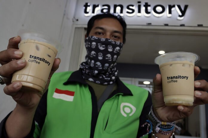 Driver ojek online, menunjukkan minuman dingin (kopi) yang di-order dengan harga promo serba Rp 5.000 di Kedai Transitory Coffee, Jalan Tole Iskandar No 40, Depok, Jawa Barat, Rabu (9/12/2020). HARNAS.ID | BARRI FATHAILAH