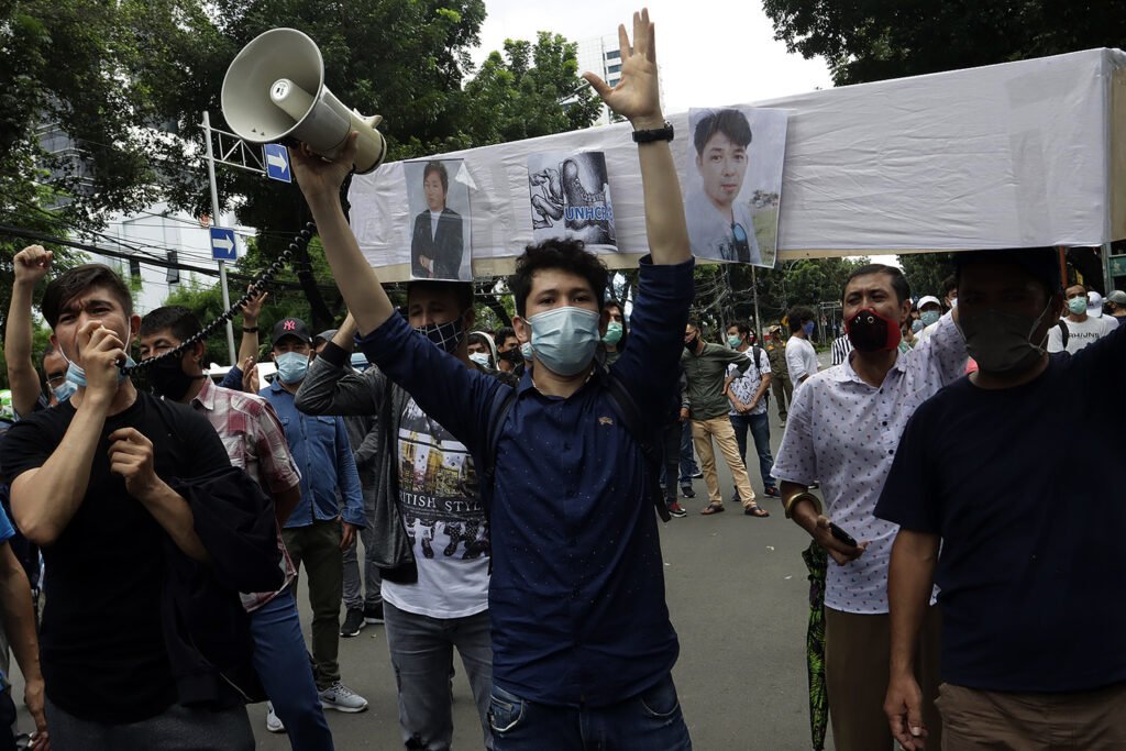 Pencari suaka membentangkan spanduk meminta dukungan bertuliskan “Refugees need you all fellow human brothers and sisters” saat berunjuk rasa di depan Kantor UNHCR, Jakarta, Senin (14/12/2020). Para pencari suaka ini mendesak proses perpindahan ke negara tujuan dipercepat, menyusul insiden 11 pengungsi bunuh diri dalam lima tahun terakhir karena depresi. Jumlah itu termasuk tiga pengungsi yang juga bunuh diri dalam dua pekan terakhir ini. HARNAS.ID | BARRI FATHAILAH