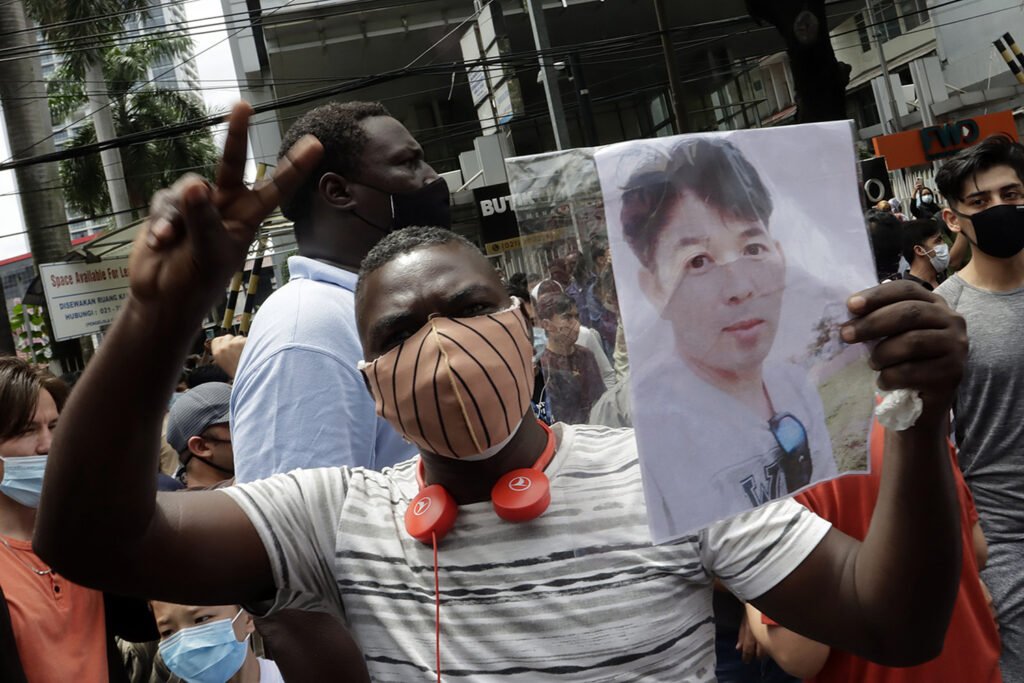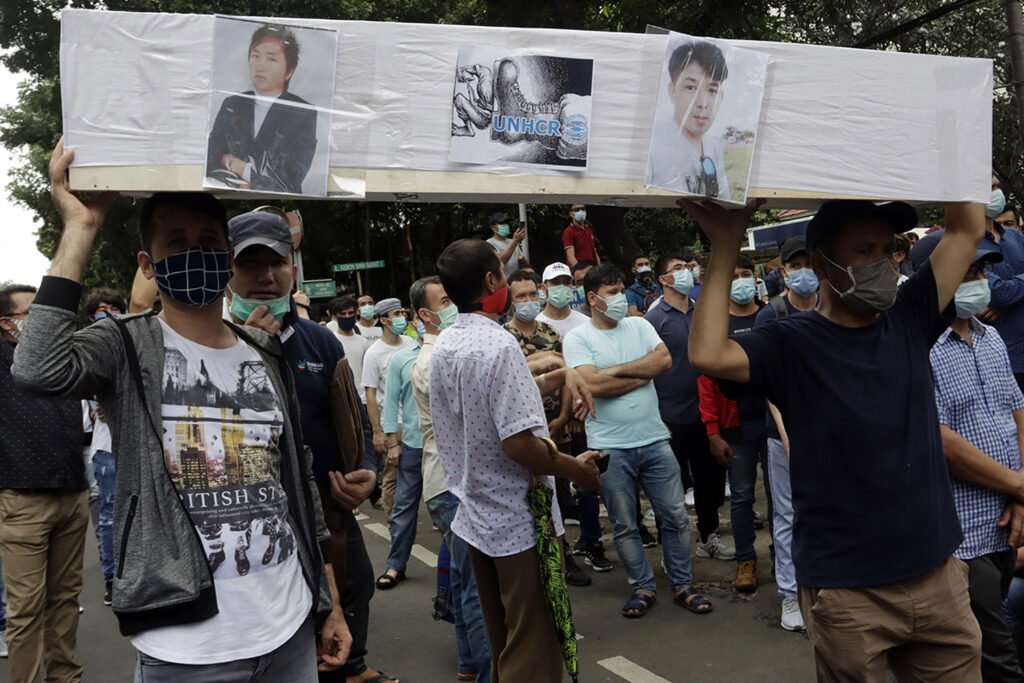Pencari suaka membawa replika peti jenazah saat berunjuk rasa di depan Kantor UNHCR, Jakarta, Senin (14/12/2020). Mereka mendesak proses perpindahan ke negara tujuan dipercepat, menyusul insiden 11 pengungsi bunuh diri dalam lima tahun terakhir karena depresi. Jumlah itu termasuk tiga pengungsi yang juga bunuh diri dalam dua pekan terakhir ini. HARNAS.ID | BARRI FATHAILAH