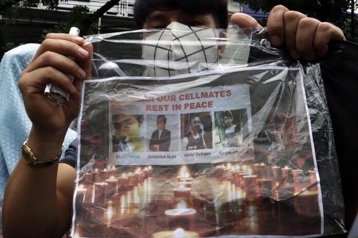 Pencari suaka menunjukkan foto korban pengungsi saat berunjuk rasa di depan Kantor UNHCR, Jakarta, Senin (14/12/2020). Para pencari suaka ini mendesak proses perpindahan ke negara tujuan dipercepat, menyusul insiden 11 pengungsi bunuh diri dalam lima tahun terakhir karena depresi. Jumlah itu termasuk tiga pengungsi yang juga bunuh diri dalam dua pekan terakhir ini. HARNAS.ID | BARRI FATHAILAH
