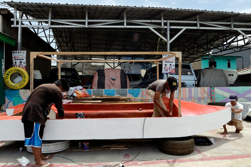 Pekerja menyelesaikan pembuatan perahu di Situ Rawa Besar, Depok, Jawa Barat, Selasa (24/11/2020). Perahu boat ini dirancang warga Kampung Lio sebagai alat transportasi penyeberangan dan destinasi wisata di situ tersebut. HARNAS.ID | BARRI FATHAILAH