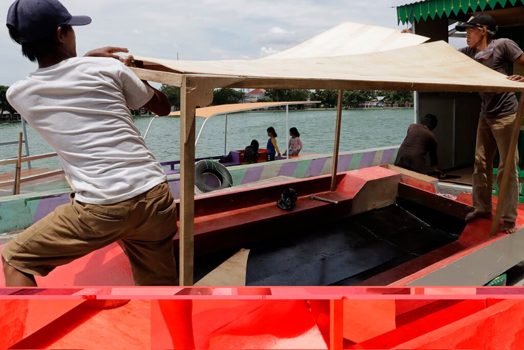 Pekerja menyelesaikan pemasangan kerangka atap perahu di Situ Rawa Besar, Depok, Jawa Barat, Selasa (24/11/2020). Perahu boat ini dirancang warga Kampung Lio sebagai alat transportasi penyeberangan dan destinasi wisata di situ tersebut. HARNAS.ID | BARRI FATHAILAH