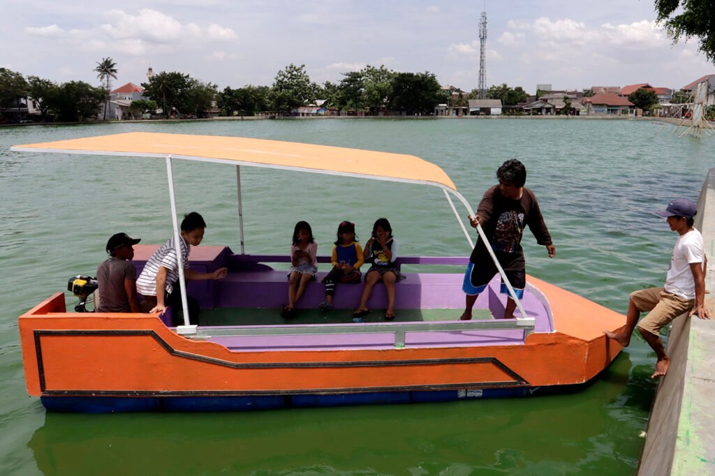 Anak-anak menaiki perahu di Situ Rawa Besar, Depok, Jawa Barat, Selasa (24/11/2020). Perahu boat yang bisa menampung 10 penumpang ini dirancang warga Kampung Lio sebagai alat transportasi penyeberangan dan destinasi wisata di situ tersebut. HARNAS.ID | BARRI FATHAILAH