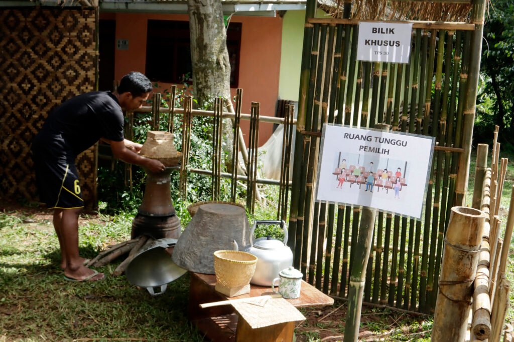 Warga mempersiapkan tempat pemungutan suara (TPS) bernuansa rumah adat di Kampung Benda Barat, Cipayung, Depok, Jawa Barat, Selasa (8/12/2020). Seluruh warga pemilih di daerah yang menggelar pesta demokrasi diimbau untuk menggunakan hak pilih pada Pilkada Serentak, Rabu (9/12/2020). HARNAS.ID | BARRI FATHAILAH