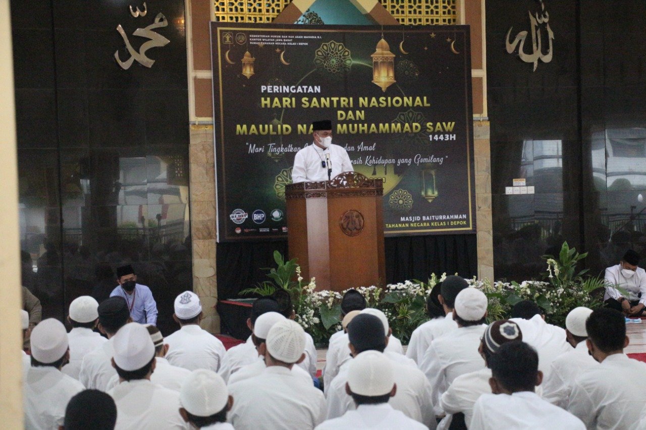 HARNAS.ID – Rumah Tahanan (Rutan) Kelas I Depok menggelar kegiatan berkaitan peringatan Hari Santri dan Maulid Nabi Muhammad SAW, Kamis (04/11/2021). Selain bertujuan untuk pembinaan rohani, kegiatan tersebut juga bertujuan mempererat tali silaturahmi antar warga binaan dengan petugas rutan.