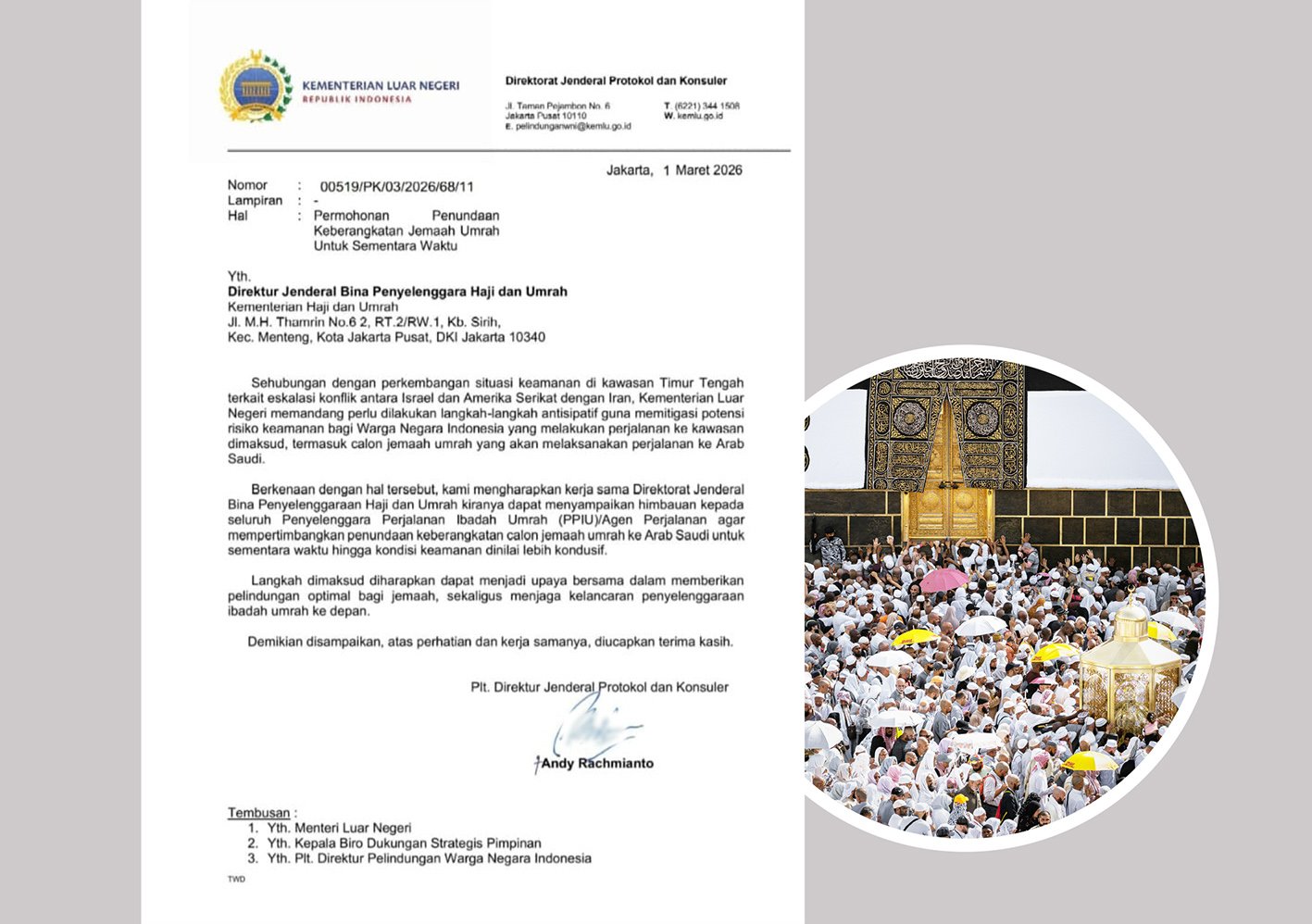 “Kiranya dapat menyampaikan himbauan kepada seluruh Penyelenggara Perjalanan Ibadah Umrah (PPIU)/Agen Perjalanan agar mempertimbangkan penundaan keberangkatan calon jemaah umrah ke Arab Saudi untuk sementara waktu hingga kondisi keamanan dinilai lebih kondusif,” tulis Andy.