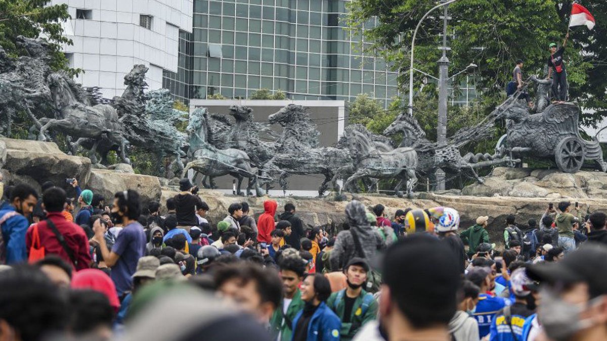 Peserta unjuk rasa mengibarkan Bendera Merah Putih di atas Patung Kuda Arjuna Wiwaha saat aksi unjuk rasa tolak UU Omnibus Law di kawasan Medan Merdeka Barat, Jakarta, Selasa (20/10/2020). Aksi gabungan buruh, petani, mahasiswa, dan pelajar yang dilakukan bersamaan dengan setahun pemerintahan Presiden Joko Widodo dan Wakil Presiden Ma'ruf Amin itu menyuarakan penolakan pengesahan Undang-undang Cipta Kerja sekaligus meminta presiden mengeluarkan Perppu pencabutan UU. ANTARA | GALIH PRADIPTA