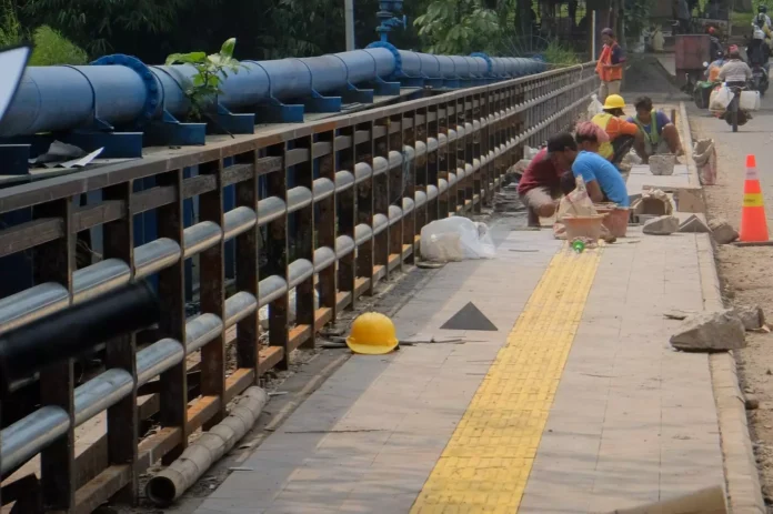 Rehabilitasi jembatan Grand Depok City (GDC) saat ini memasuki tahapan pengerjaan pemasangan keramik dengan pola pedestrian. Progres ini dikerjakan setelah sebelumnya dilakukan pekerjaan perapihan railing jembatan.