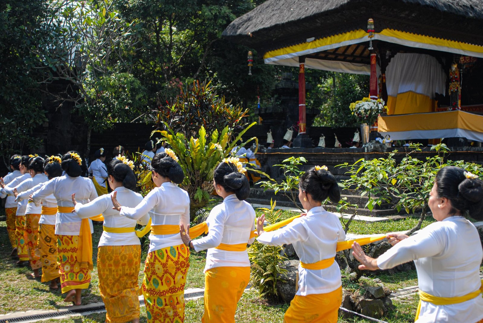 Penari mengitari pura Parahayangan Agung Jagatkartta, sebagai ritual ibadah Pujawali.