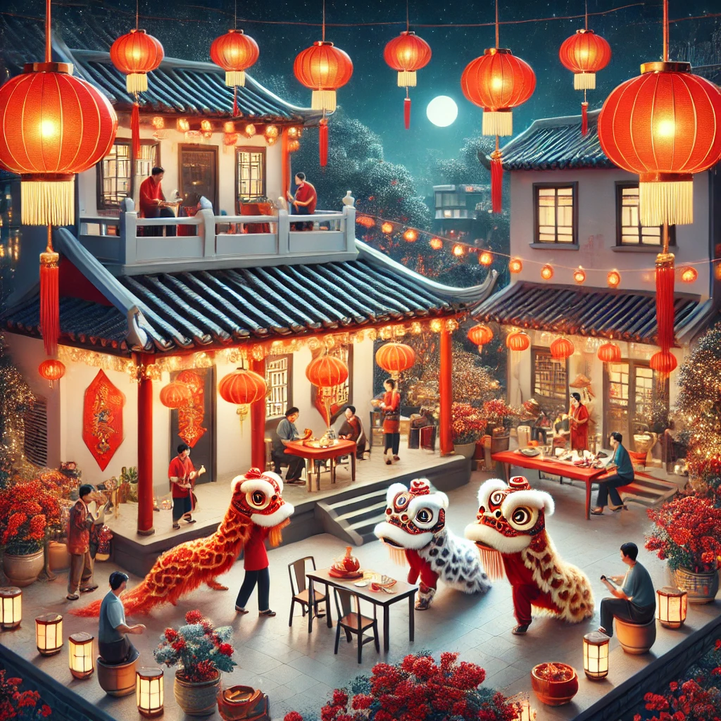 Gambar rekayasa telah dibuat, menggambarkan suasana meriah perayaan Tahun Baru Imlek dengan dekorasi lentera merah dan aktivitas budaya tradisional.