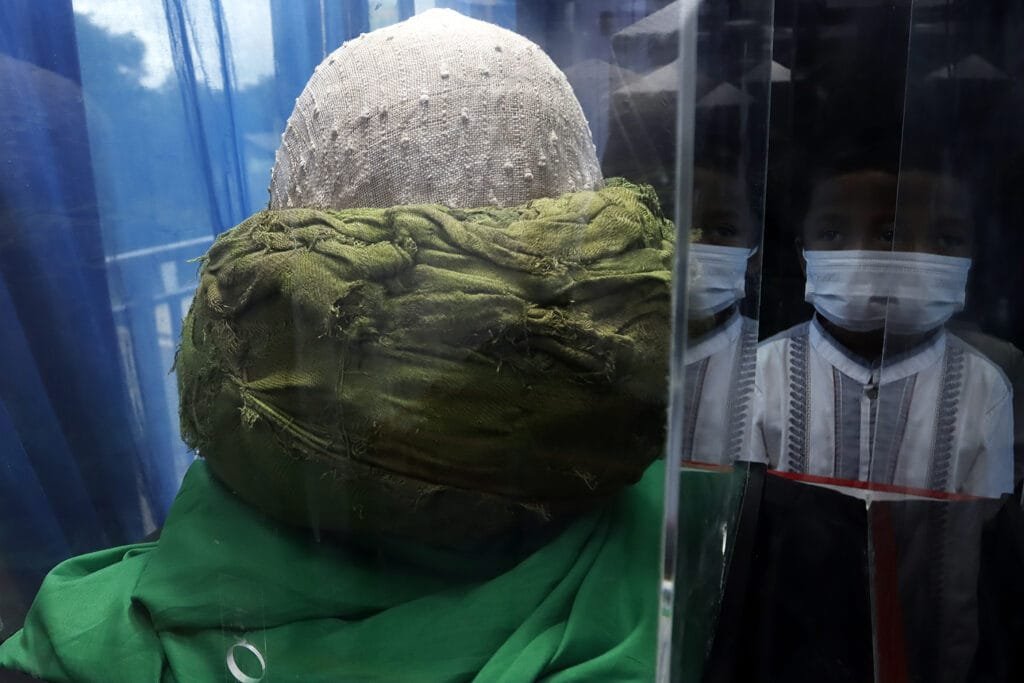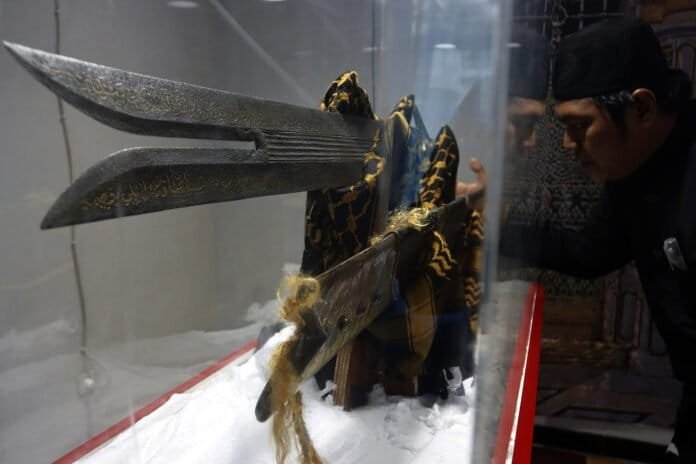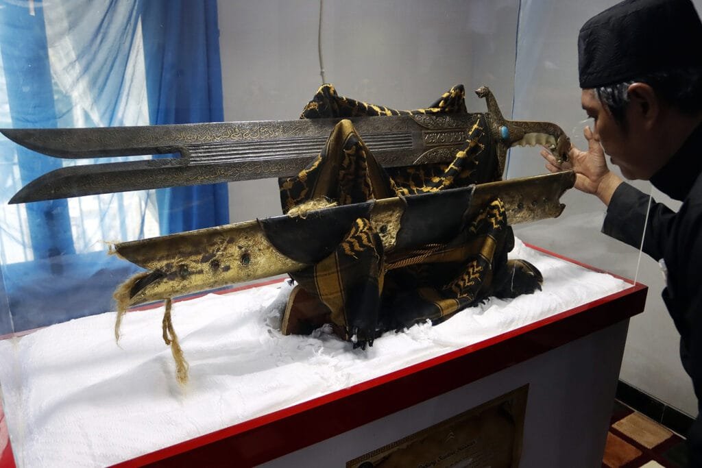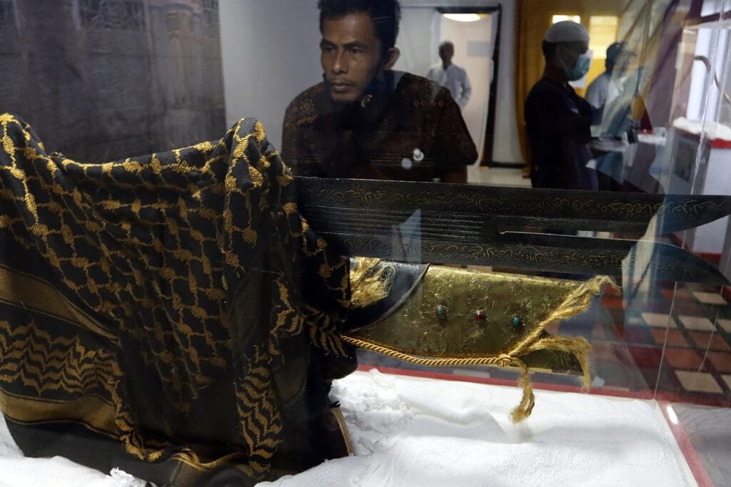 Pengunjung mengamati Pedang Saidina Hussain warisan dari Ali Bin Abi Thalib yang terakhir kali dipakai saat peristiwa Karbala oleh Saidina Hussain RA dalam perjalanan ke Kufah, hingga dibunuh oleh tentara Bani Umaiyyah pada Pameran Artefak Rasulullah SAW dan Para Sahabat di Masjid Jami At-Taqwa, Tapos, Depok, Jawa Barat, Jumat (1/1/2021). Pameran ini menampilkan beberapa benda-benda bersejarah peninggalan Rasulullah SAW dan para sahabat seperti tongkat, alas kaki, sorban, rambut serta pedang Saidina Hussain yang bertujuan untuk meningkatkan ghirah (semangat) mencintai Rasulullah SAW. HARNAS.ID | BARRI FATHAILAH
