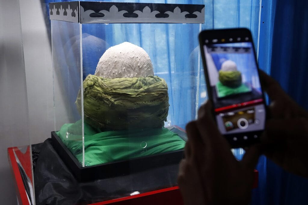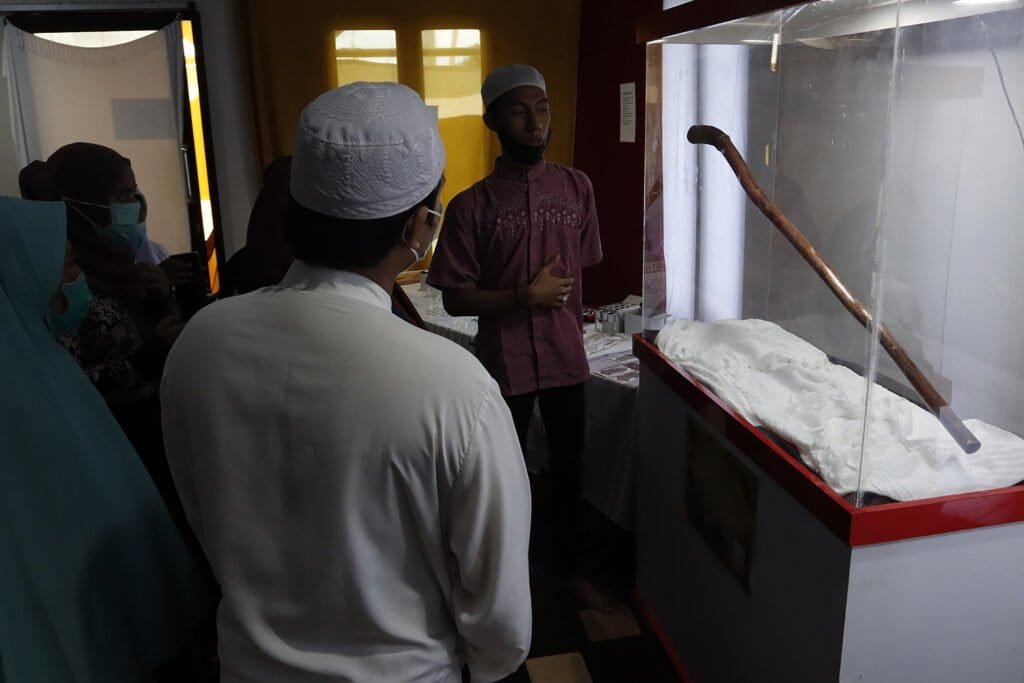 Pengunjung melihat Sorban Rasulullah SAW yang diberikan oleh sahabat Mu’adz Bin Jabal pada Pameran Artefak Rasulullah SAW dan Para Sahabat di Masjid Jami At-Taqwa, Tapos, Depok, Jawa Barat, Jumat (1/1/2021). Pameran ini menampilkan beberapa benda-benda bersejarah peninggalan Rasulullah SAW dan para sahabat seperti tongkat, alas kaki, sorban, rambut serta pedang Saidina Hussain yang bertujuan untuk meningkatkan ghirah (semangat) mencintai Rasulullah SAW. HARNAS.ID | BARRI FATHAILAHPengunjung melihat Sorban Rasulullah SAW yang diberikan oleh sahabat Mu’adz Bin Jabal pada Pameran Artefak Rasulullah SAW dan Para Sahabat di Masjid Jami At-Taqwa, Tapos, Depok, Jawa Barat, Jumat (1/1/2021). Pameran ini menampilkan beberapa benda-benda bersejarah peninggalan Rasulullah SAW dan para sahabat seperti tongkat, alas kaki, sorban, rambut serta pedang Saidina Hussain yang bertujuan untuk meningkatkan ghirah (semangat) mencintai Rasulullah SAW. HARNAS.ID | BARRI FATHAILAHPengunjung melihat Tongkat Baginda Rasulullah SAW yakni Al Saaja, peninggalan dari Nabi Ibrahim AS pada Pameran Artefak Rasulullah SAW dan Para Sahabat di Masjid Jami At-Taqwa, Tapos, Depok, Jawa Barat, Jumat (1/1/2021). Pameran ini menampilkan beberapa benda-benda bersejarah peninggalan Rasulullah SAW dan para sahabat seperti tongkat, alas kaki, sorban, rambut serta pedang Saidina Hussain yang bertujuan untuk meningkatkan ghirah (semangat) mencintai Rasulullah SAW. HARNAS.ID | BARRI FATHAILAHPengunjung melihat Tongkat Baginda Rasulullah SAW yakni Al Saaja, peninggalan dari Nabi Ibrahim AS pada Pameran Artefak Rasulullah SAW dan Para Sahabat di Masjid Jami At-Taqwa, Tapos, Depok, Jawa Barat, Jumat (1/1/2021). Pameran ini menampilkan beberapa benda-benda bersejarah peninggalan Rasulullah SAW dan para sahabat seperti tongkat, alas kaki, sorban, rambut serta pedang Saidina Hussain yang bertujuan untuk meningkatkan ghirah (semangat) mencintai Rasulullah SAW. HARNAS.ID | BARRI FATHAILAHTongkat Baginda Rasulullah SAW yakni Al Saaja, peninggalan dari Nabi Ibrahim AS di Pameran Artefak Rasulullah SAW dan Para Sahabat di Masjid Jami At-Taqwa, Tapos, Depok, Jawa Barat, Jumat (1/1/2021). Pameran ini menampilkan beberapa benda-benda bersejarah peninggalan Rasulullah SAW dan para sahabat seperti tongkat, alas kaki, sorban, rambut serta pedang Saidina Hussain yang bertujuan untuk meningkatkan ghirah (semangat) mencintai Rasulullah SAW. HARNAS.ID | BARRI FATHAILAHRambut Rasulullah SAW yang diriwayatkan Ali Bin Abi Thalib ditampilkan pada Pameran Artefak Rasulullah SAW dan Para Sahabat di Masjid Jami At-Taqwa, Tapos, Depok, Jawa Barat, Jumat (1/1/2021). Pameran ini menampilkan beberapa benda-benda bersejarah peninggalan Rasulullah SAW dan para sahabat seperti tongkat, alas kaki, sorban, rambut serta pedang Saidina Hussain yang bertujuan untuk meningkatkan ghirah (semangat) mencintai Rasulullah SAW. HARNAS.ID | BARRI FATHAILAHAlas kaki Baginda Rasulullah SAW, pemberian hadiah dari Raja Syiriah yang terbuat dari kulit unta ditampilkan pada Pameran Artefak Rasulullah SAW dan Para Sahabat di Masjid Jami At-Taqwa, Tapos, Depok, Jawa Barat, Jumat (1/1/2021). Pameran ini menampilkan beberapa benda-benda bersejarah peninggalan Rasulullah SAW dan para sahabat seperti tongkat, alas kaki, sorban, rambut serta pedang Saidina Hussain yang bertujuan untuk meningkatkan ghirah (semangat) mencintai Rasulullah SAW. HARNAS.ID | BARRI FATHAILAHPengunjung mengamati Pedang Saidina Hussain warisan dari Ali Bin Abi Thalib yang terakhir kali dipakai saat peristiwa Karbala oleh Saidina Hussain RA dalam perjalanan ke Kufah, hingga dibunuh oleh tentara Bani Umaiyyah pada Pameran Artefak Rasulullah SAW dan Para Sahabat di Masjid Jami At-Taqwa, Tapos, Depok, Jawa Barat, Jumat (1/1/2021). Pameran ini menampilkan beberapa benda-benda bersejarah peninggalan Rasulullah SAW dan para sahabat seperti tongkat, alas kaki, sorban, rambut serta pedang Saidina Hussain yang bertujuan untuk meningkatkan ghirah (semangat) mencintai Rasulullah SAW. HARNAS.ID | BARRI FATHAILAHPengunjung mengamati Pedang Saidina Hussain warisan dari Ali Bin Abi Thalib yang terakhir kali dipakai saat peristiwa Karbala oleh Saidina Hussain RA dalam perjalanan ke Kufah, hingga dibunuh oleh tentara Bani Umaiyyah pada Pameran Artefak Rasulullah SAW dan Para Sahabat di Masjid Jami At-Taqwa, Tapos, Depok, Jawa Barat, Jumat (1/1/2021). Pameran ini menampilkan beberapa benda-benda bersejarah peninggalan Rasulullah SAW dan para sahabat seperti tongkat, alas kaki, sorban, rambut serta pedang Saidina Hussain yang bertujuan untuk meningkatkan ghirah (semangat) mencintai Rasulullah SAW. HARNAS.ID | BARRI FATHAILAH