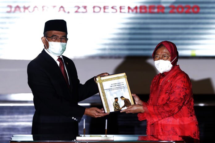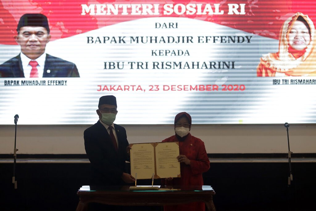 Menteri Koordinator Bidang Pembangunan Manusia dan Kebudayaan yang juga Menteri Sosial Ad Interim Muhajir Effendi (kiri) menyerahkan Memori Jabatan Kementerian Sosial kepada Menteri Sosial Tri Rismaharini (kanan) saat acara serah terima jabatan Menteri Sosial di Kantor Kementerian Sosial, Jakarta, Rabu (23/12/2020). Tri Rismaharini resmi dipilih dan dilantik Presiden Joko Widodo sebagai Menteri Sosial menggantikan Juliari P Batubara yang tersandung kasus korupsi dana bantuan sosial (bansos) COVID-19. HARNAS.ID | BARRI FATHAILAH