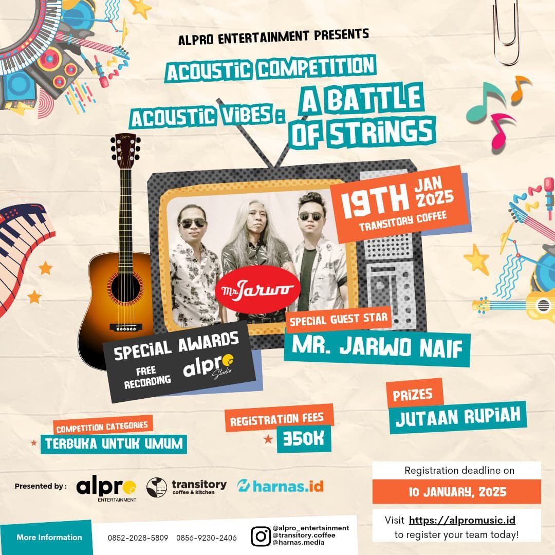 Harnas.id, Depok – Dunia musik Indonesia kembali diramaikan dengan gelaran kompetisi akustik bertajuk “Acoustic Vibes: A Battle of Strings”. Acara yang diselenggarakan oleh Alpro Entertainment ini akan digelar pada 19 Januari 2025 di Transitory Coffee, sebuah kafe yang dikenal sebagai wadah kreatif komunitas musik lokal.