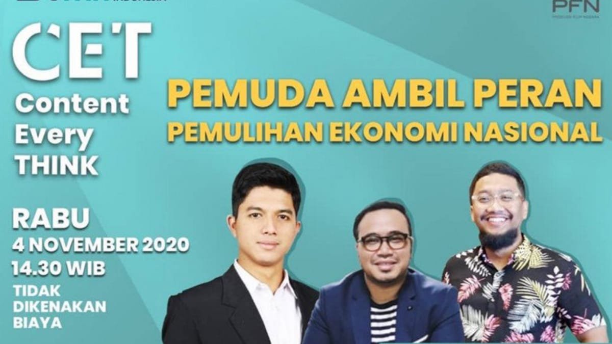 Perum Produksi Film Negara (PFN) kembali menghadirkan diskusi virtual Content Every THINK! atau populer disebut CET web-talks hari ini. Diskusi kali ini membahas tema “Pemuda Ambil Peran Pemulihan Ekonomi Nasional”.