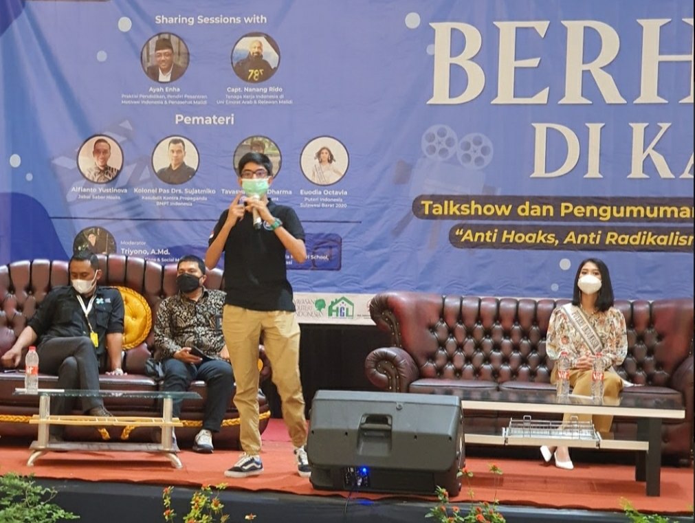 Adapun narasumber yang mengisi acara talkshow ‘Berhenti di Kamu’ adalah Perwakilan Jabar Saber Hoaks, Alfianto Yustinova; Perwakilan Subnit Kontra Propaganda BNPT Indonesia, Ferdy Nourika; Antihoax Student, Tavasya Tirtha Dharma; dan Puteri Indonesia Sulawesi Barat 2020, Euodia Octavia.