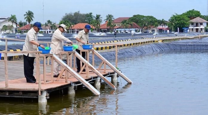 Dalam kunjungan tersebut, Presiden Prabowo didampingi Menteri Kelautan dan Perikanan Sakti Wahyu Trenggono serta Wakil Menteri Didit Herdiawan, melakukan penebaran benih ikan nila salin di salah satu kolam tambak.