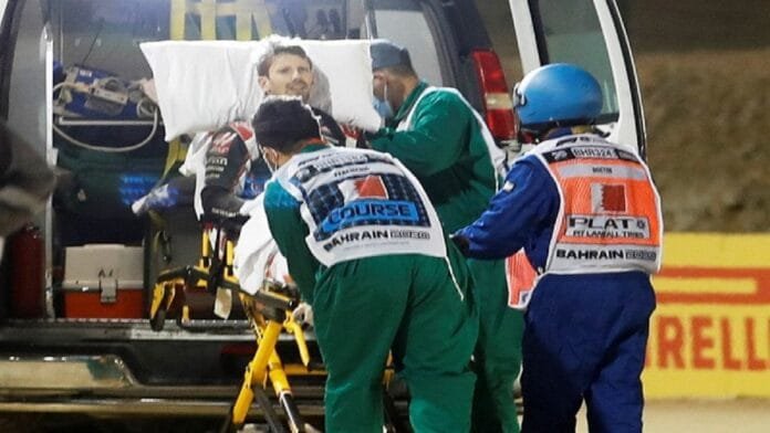 Grosjean menabrak pagar pembatas yang terbuat dari besi hingga robek setelah kehilangan kendali menyusul senggolan dengan mobil AlphaTauri Daniil Kvyat di lap pertama. Grosjean keluar dari kobaran api yang melahap kokpit mobilnya. Ia menaiki pagar dibantu oleh para marshal yang sigap memadamkan api di pinggir lintasan. Juru bicara tim Haas mengatakan Grosjean mengalami luka bakar ringan di tangan dan pergelangan kakinya dan kemungkinan retak tulang rusuk karena kecelakaan itu.